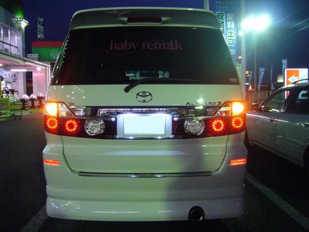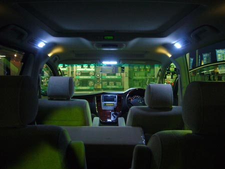 そうそう、室内ももちろんLED化されています。こちらも「GARAX」のアルファード専用LEDランプセットを使用。フロント・リアのマップ、ルームランプにラゲッジランプ、ナンバー灯の計9点セットで、夜のライトアップをより一層煌びやかに引き立ててくれています。写真左から3枚目がそうですが、ウットリしちゃいますよね!!
