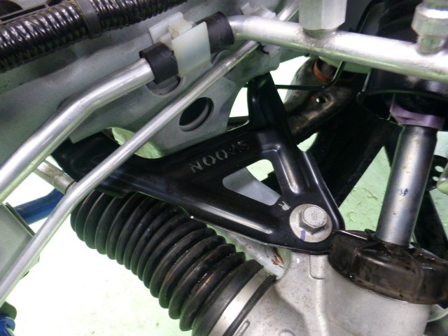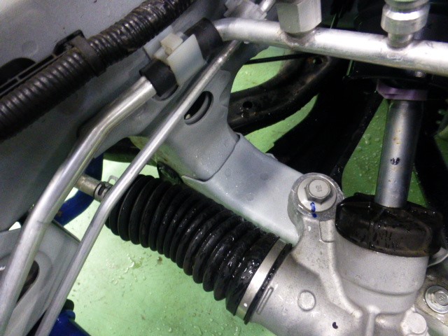 ステアリングラック取り付けボルトに補強パーツを組み込み強度をあげ、