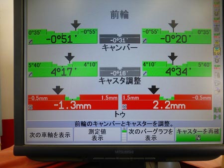 前輪のトー角という角度が左右で+、-になっているとハンドル曲りの原因になります。