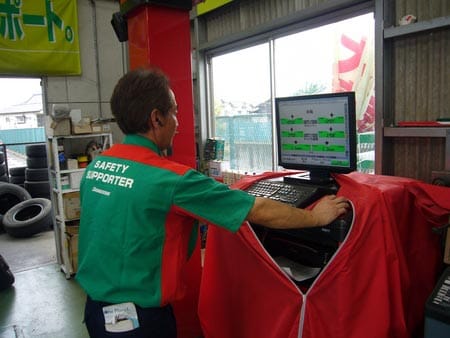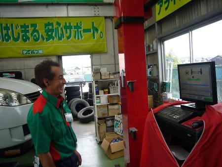 加藤工場長は当店の中でもベテランスタッフ!!色々知っていて、なんでも話しやすい先輩なんですよ☆この写真はアライメント調整作業中の様子です。特にアライメント作業はエキスパート!!!真剣な表情から・・・・余裕の笑みです!・・・さすが。エキスパートの貫禄です(´ー`)