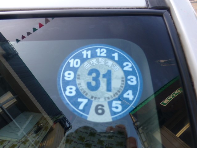 フロントガラスの左上に貼ってある丸いステッカーは定期点検時期を表しています。