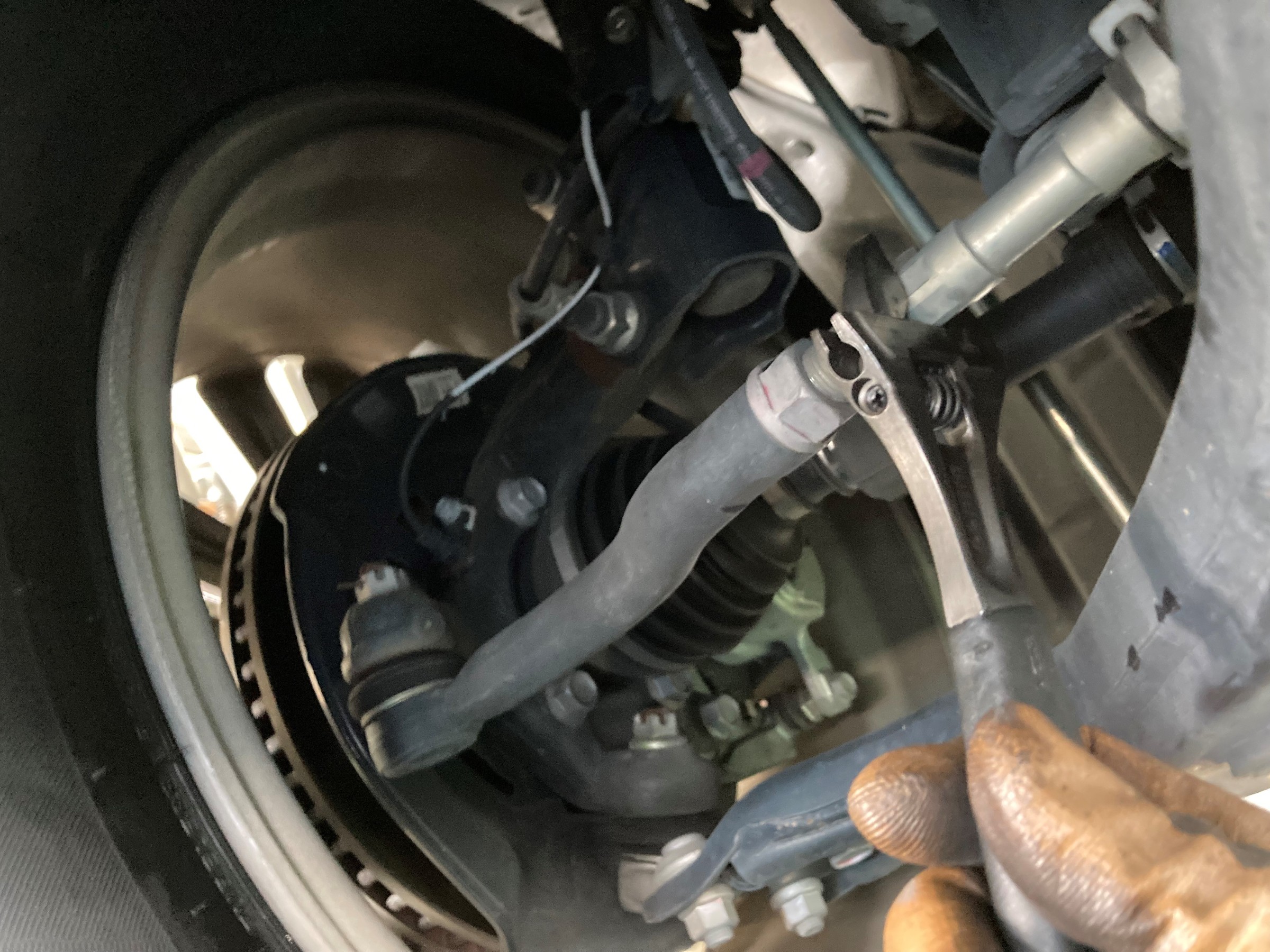 クルマの下に潜り、最適な数値に戻す調整作業を