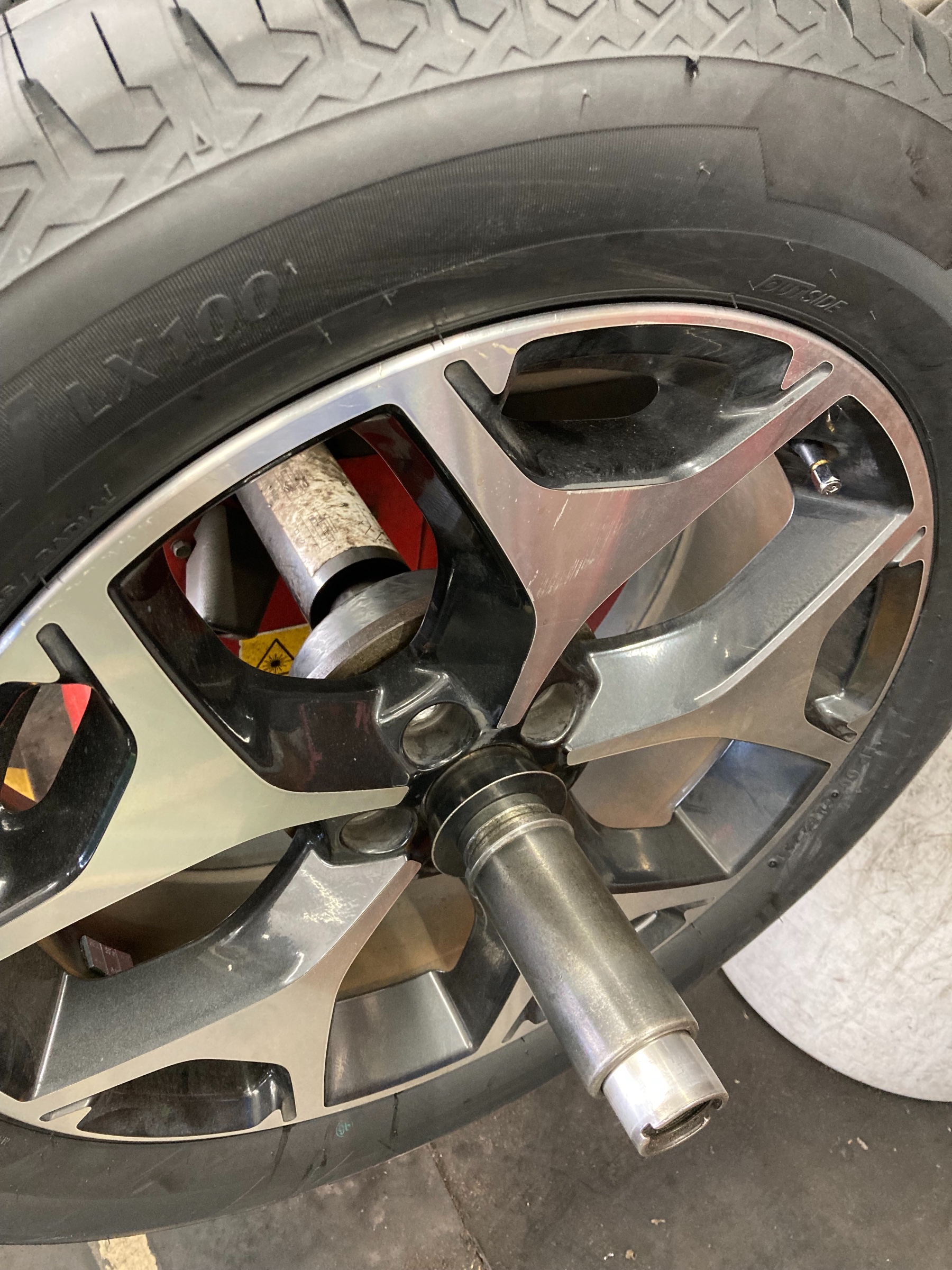 バランサーでタイヤを回転させ測定しズレが生じている場合