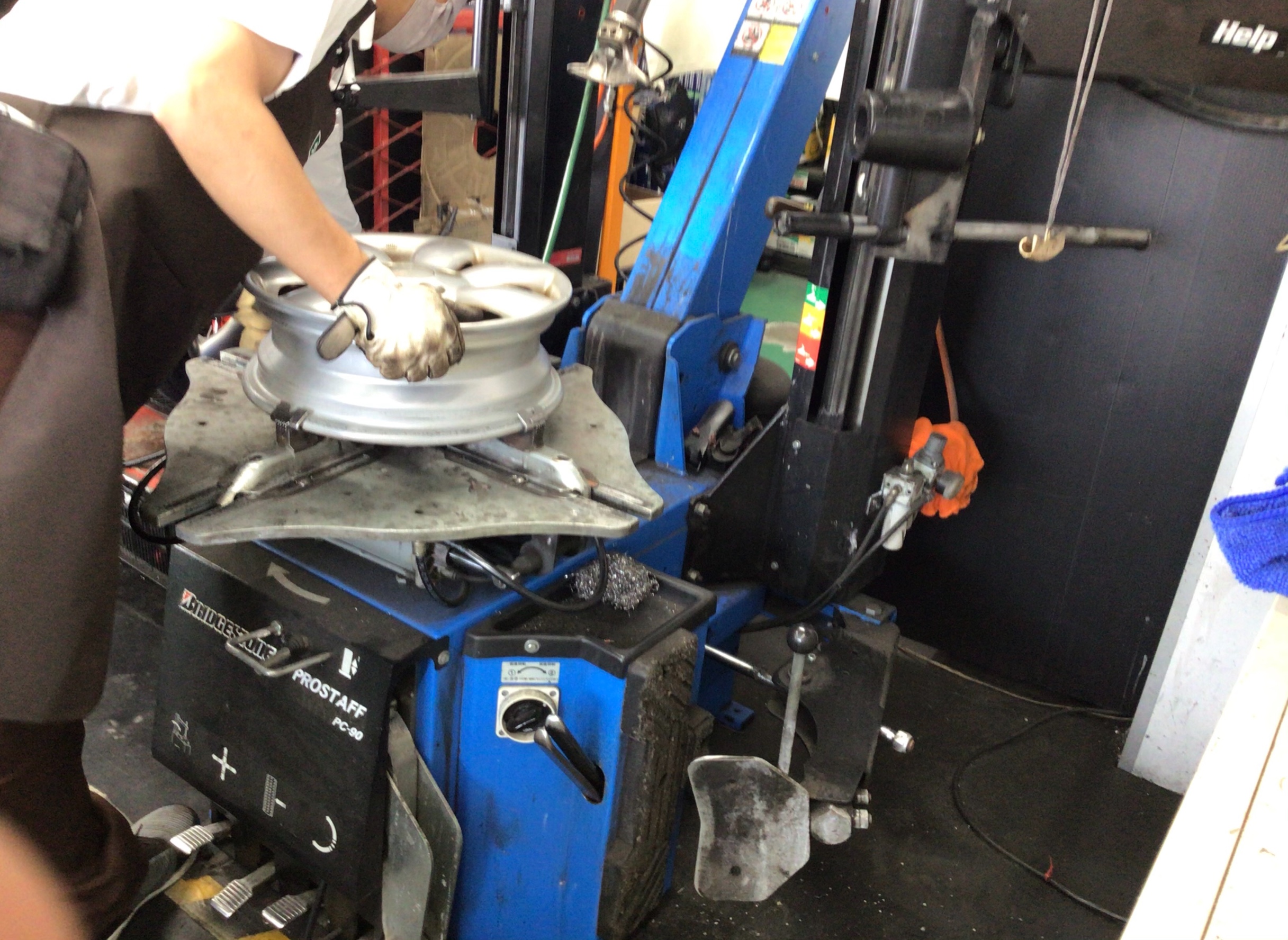 ↓ ホイールから古いタイヤを剥がし新品タイヤを
