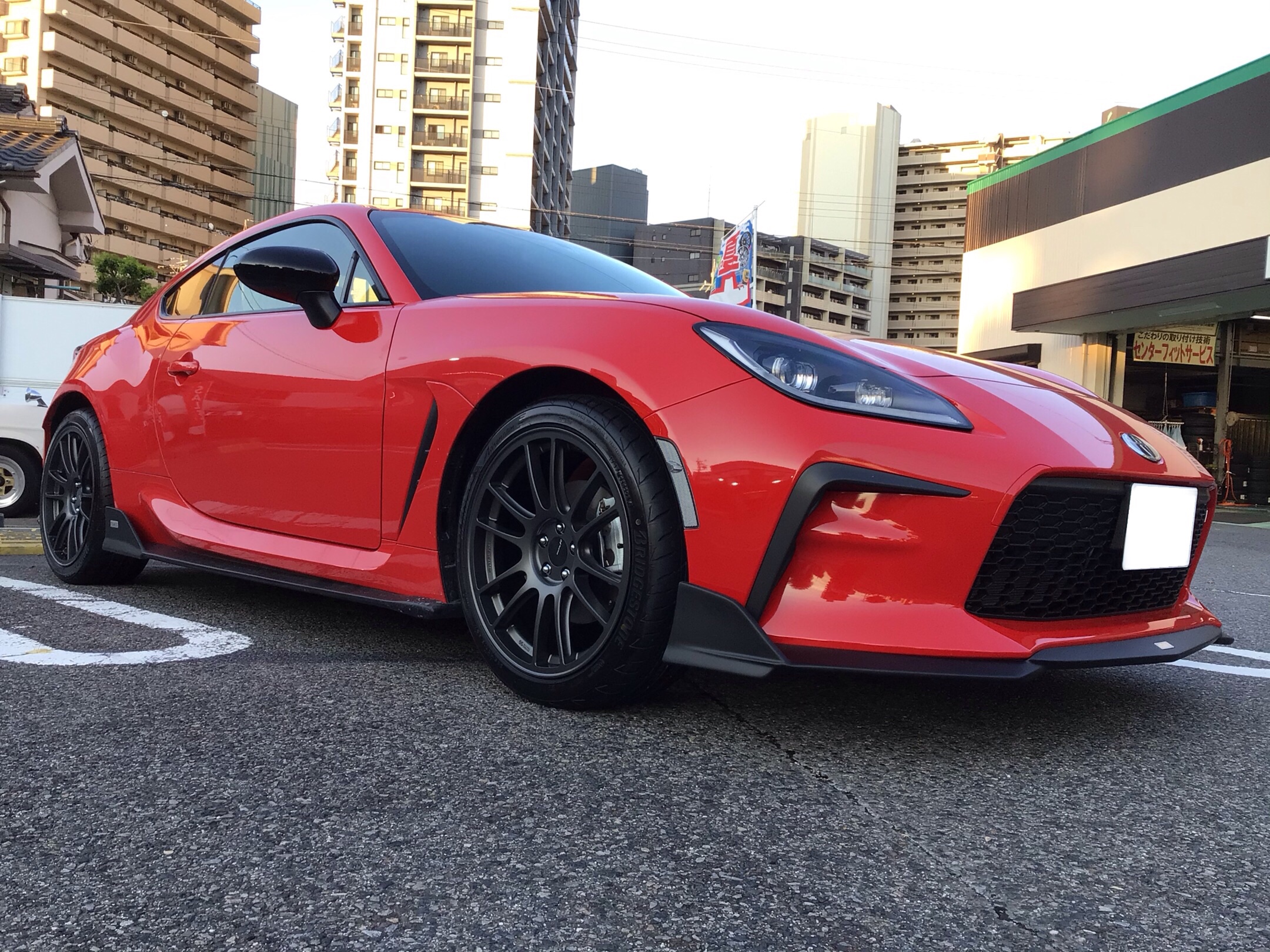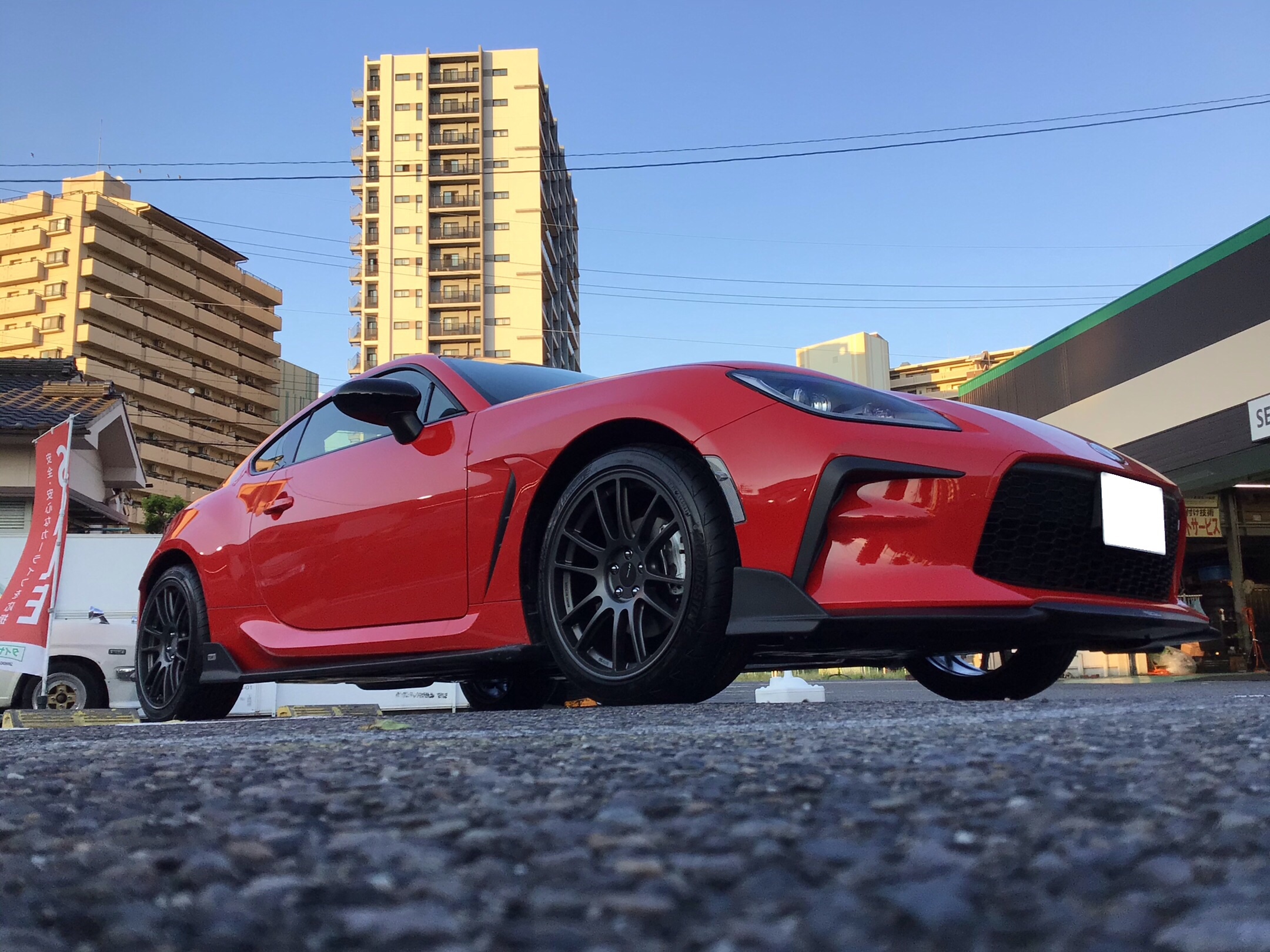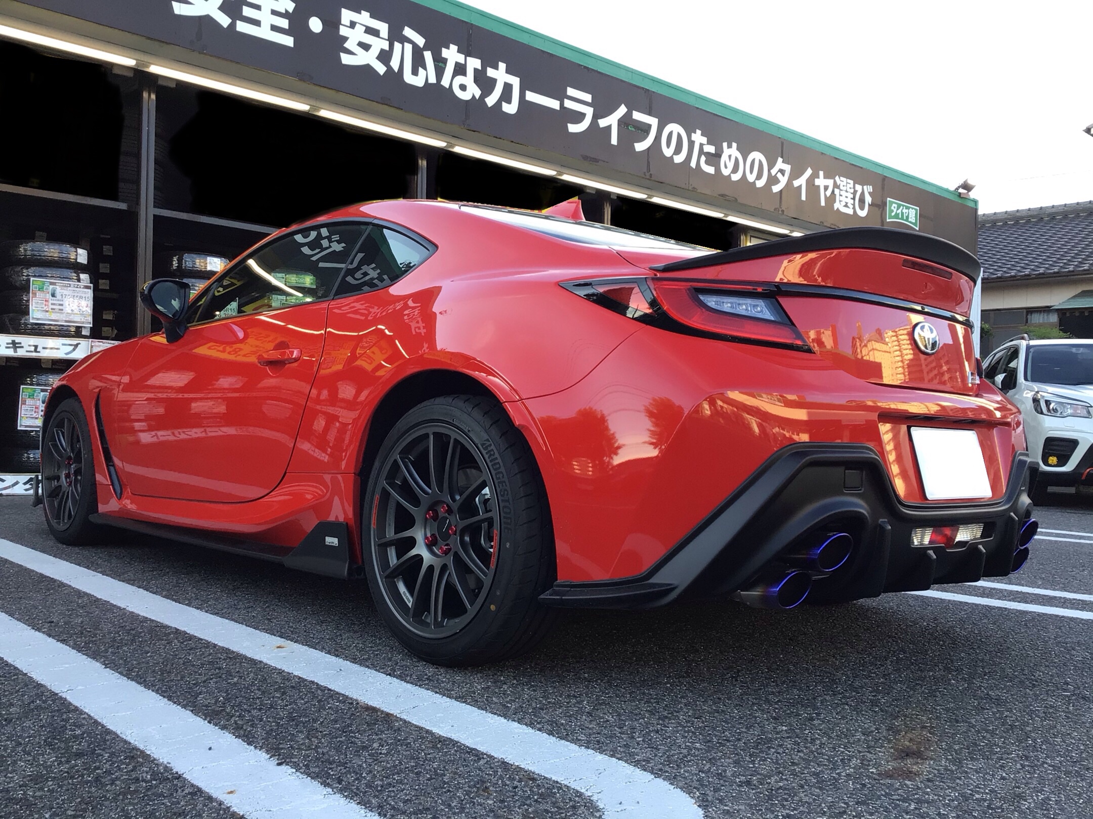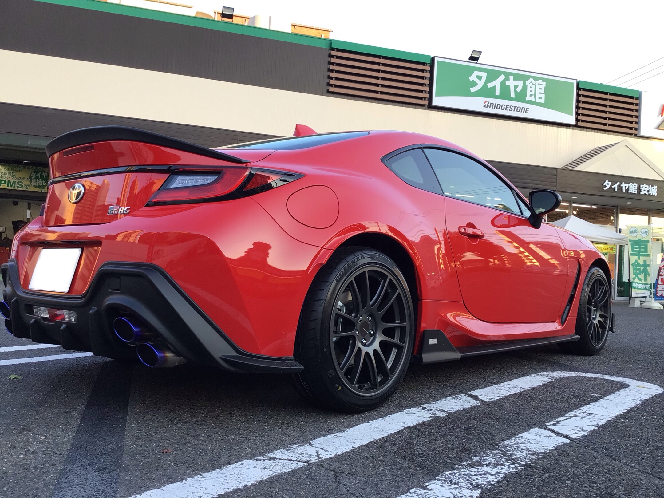 GR86のインチアップです。タイヤ・アルミホイールを純正17インチから18インチに。赤いボディにガンメタカラーのホイールがとても似合ってます!