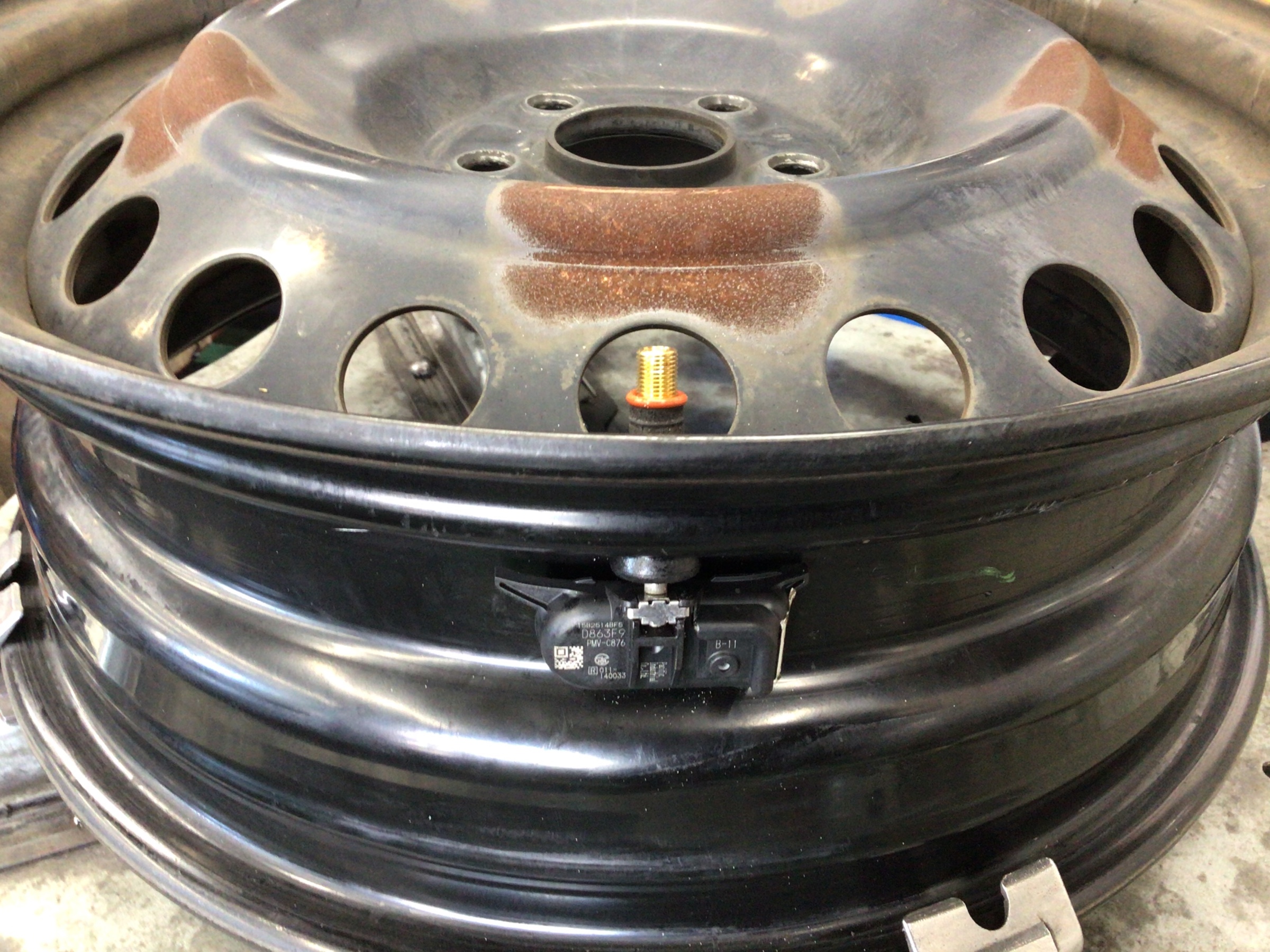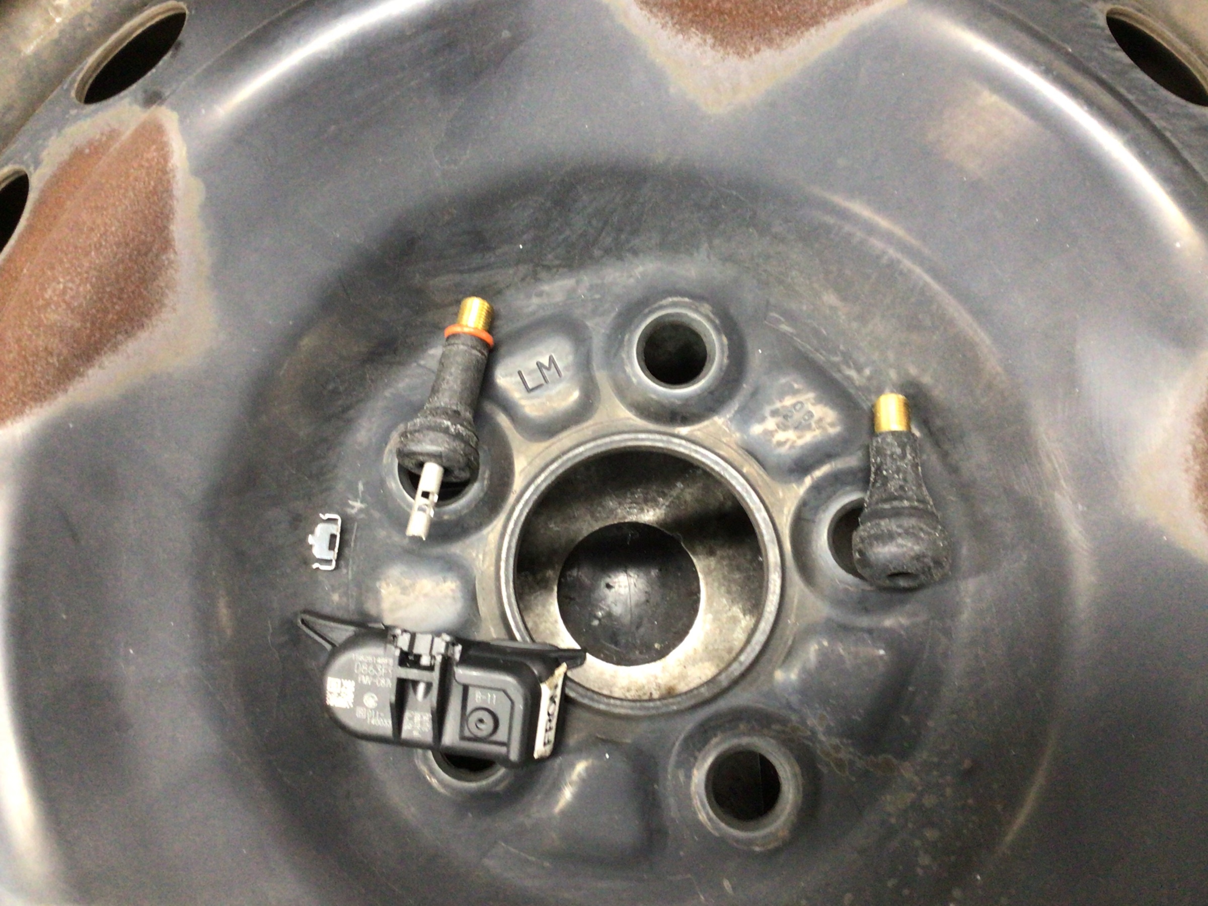 空気圧センサーを取り付けるとこんな感じ。タイヤが回転すると車内の受信機に無線で空気圧の情報を飛ばします。