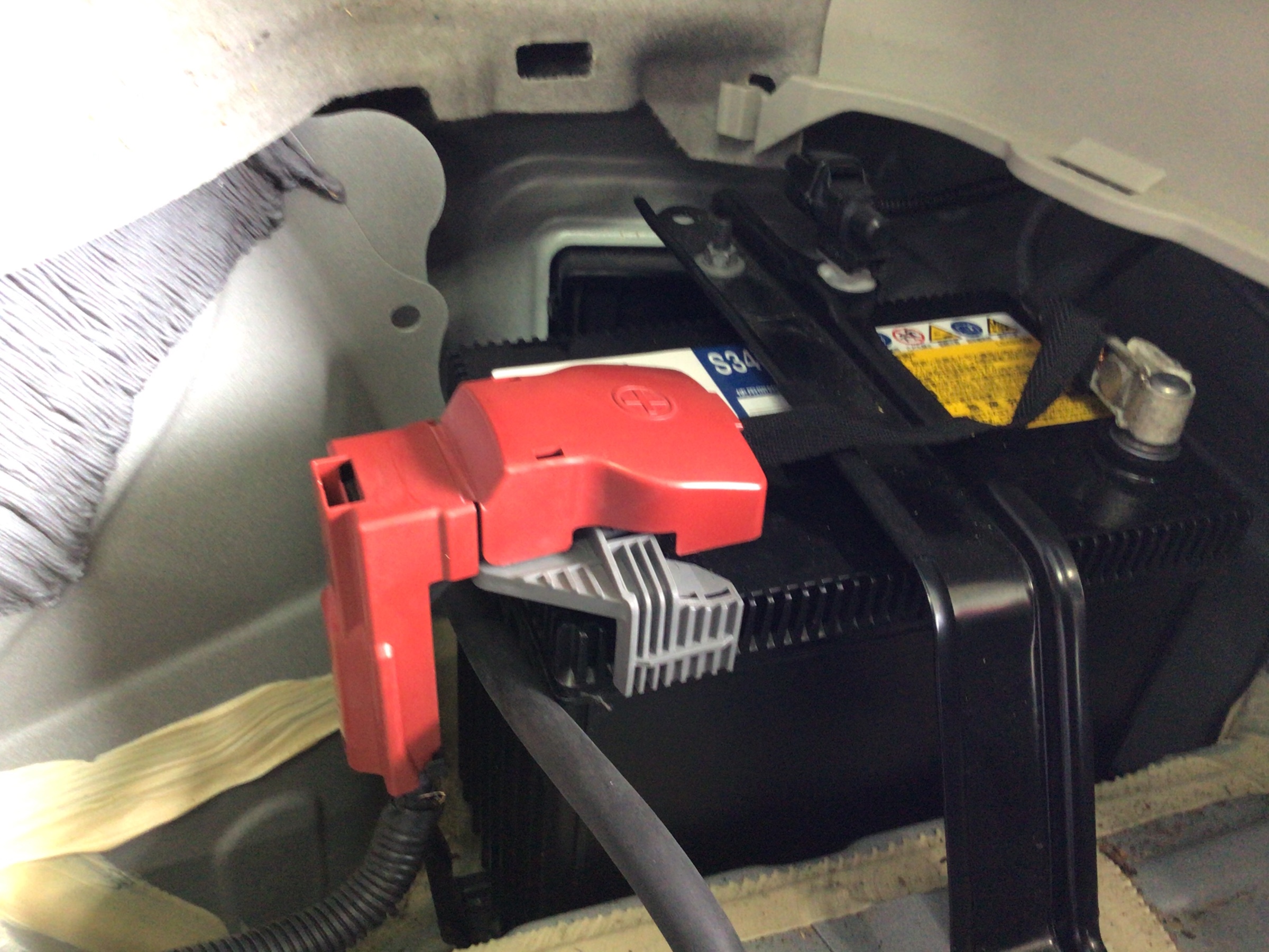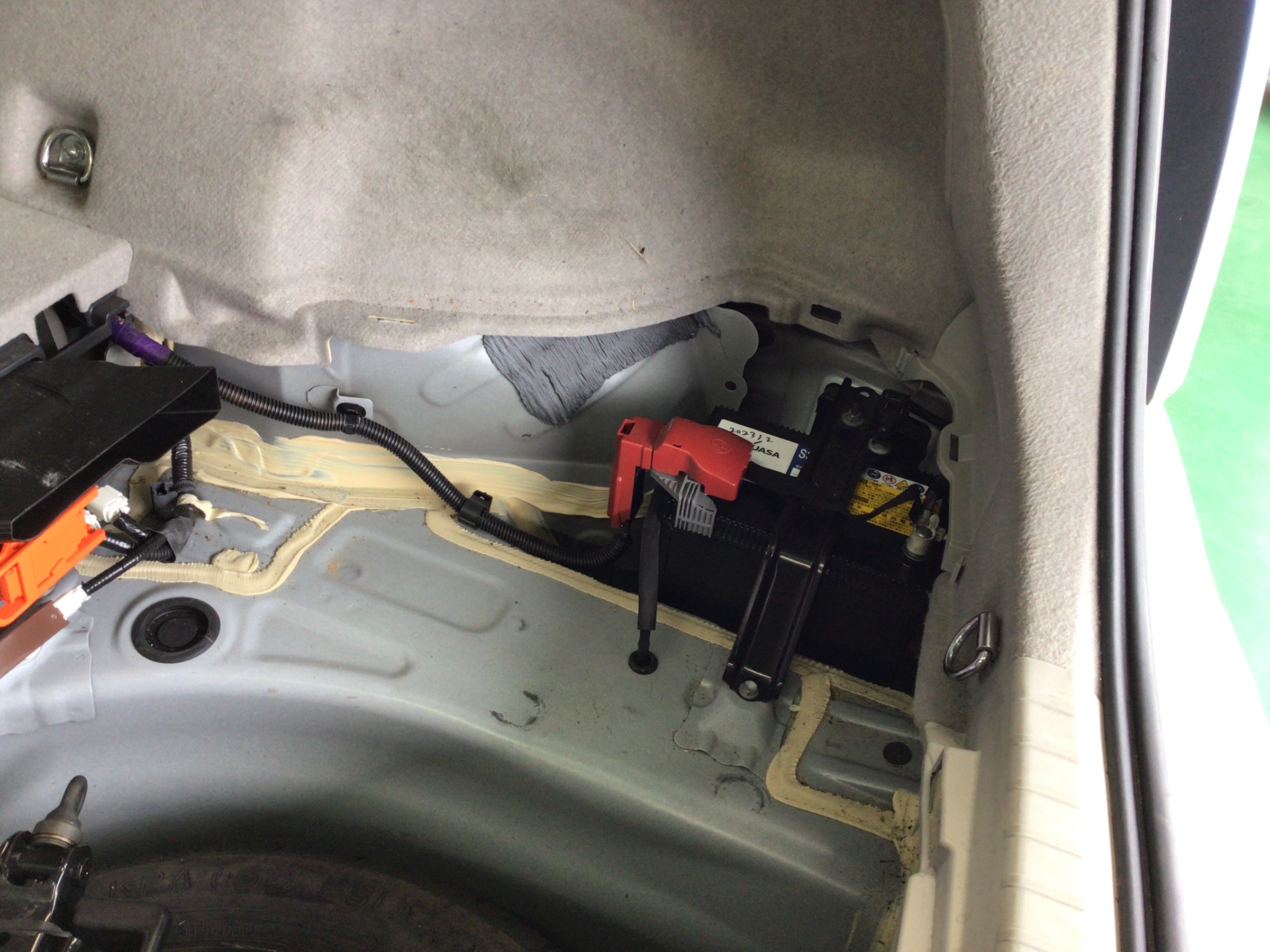 トランクの床パネルを取り除くと右端にバッテリーが設置してあるのが確認できます。