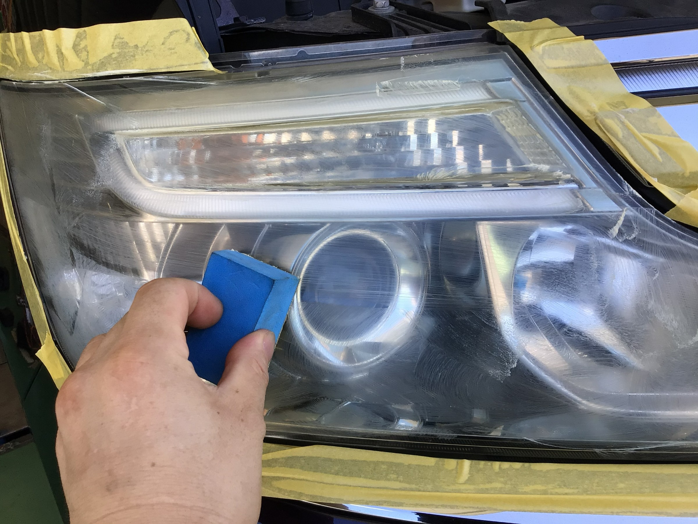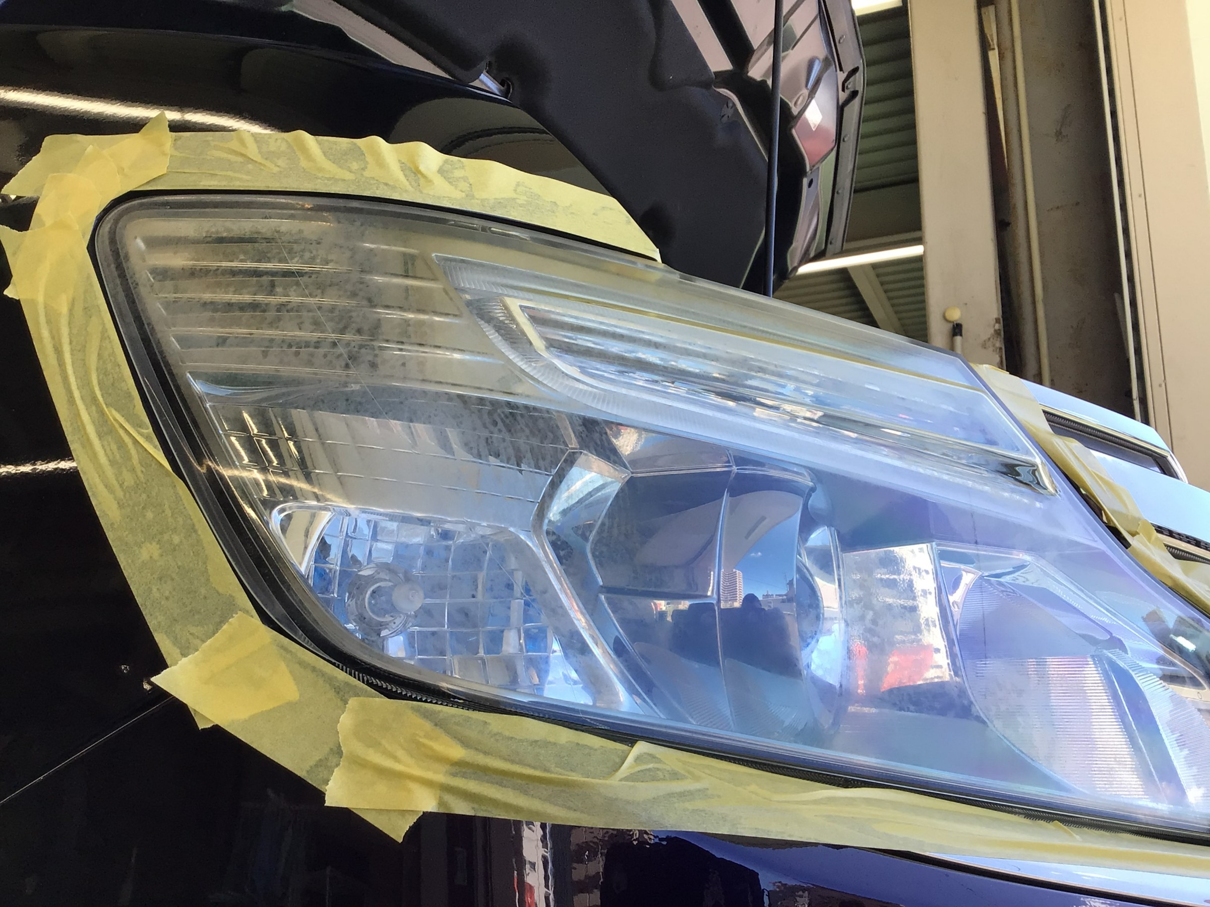 ヘッドライトの汚れを取り除く専用のクリーナーで落としていきます。前準備としてマスキングテープでヘッドライトを囲います。