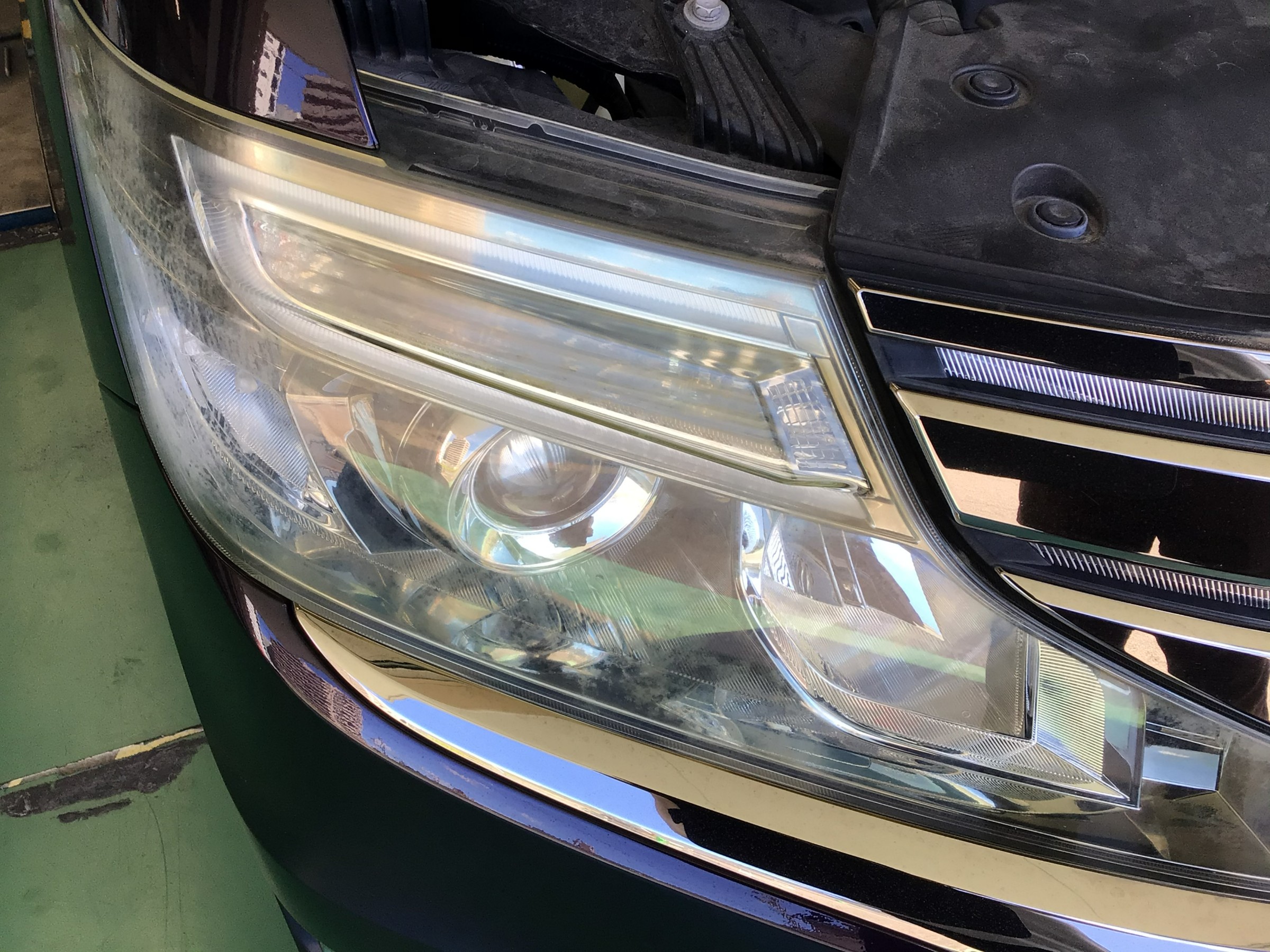 洗車でゴシゴシ擦っても取れないヘッドライトの汚れて。ステップワゴンも部分的に白くくすんでいます。