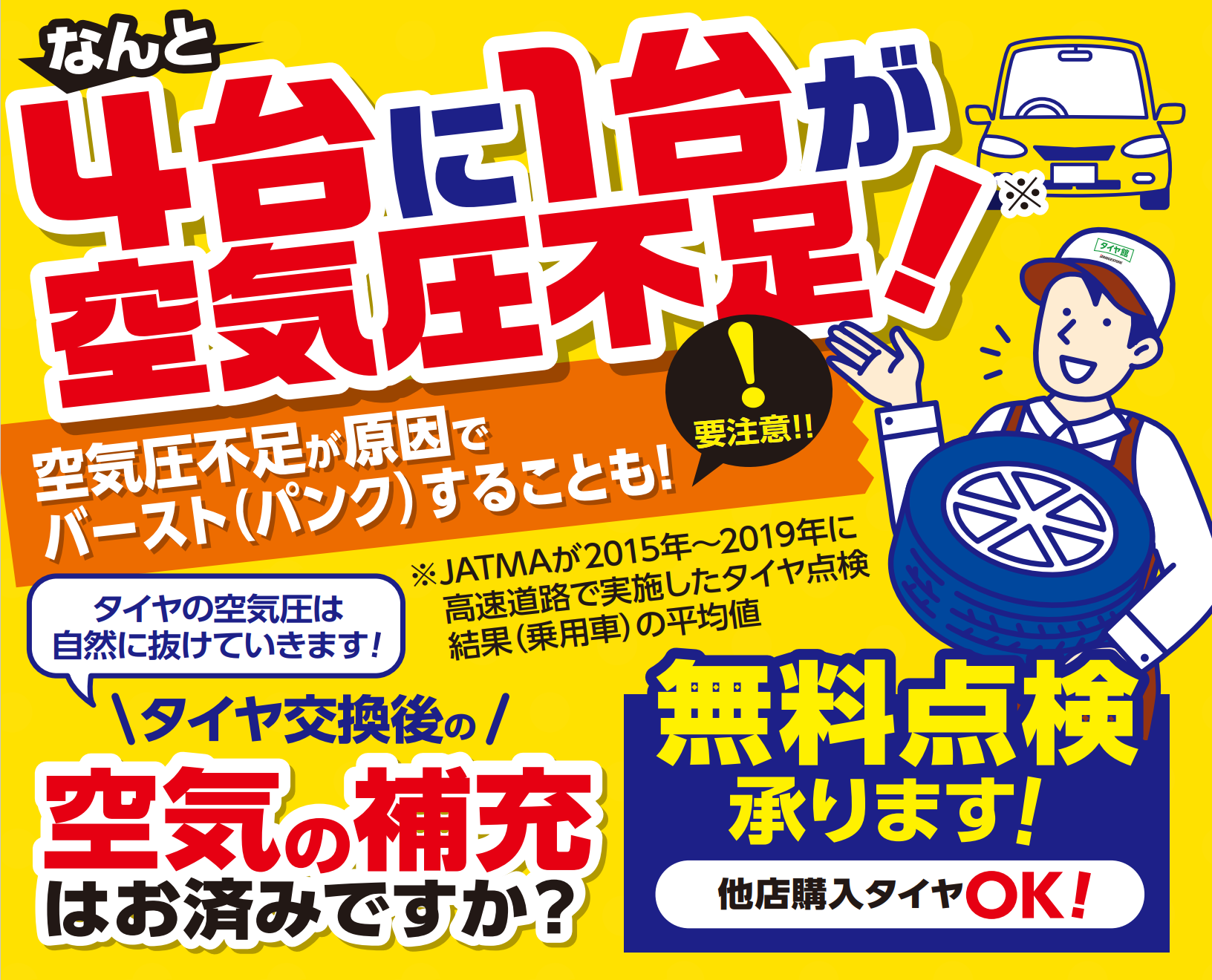タイヤ館安城店では、いつでもタイヤの空気圧点検を無料で実施しています。当店でご購入いただいてないタイヤでも点検いたします。お気軽にお越しいただき、スタッフに「空気圧点検」とお申し付けください。