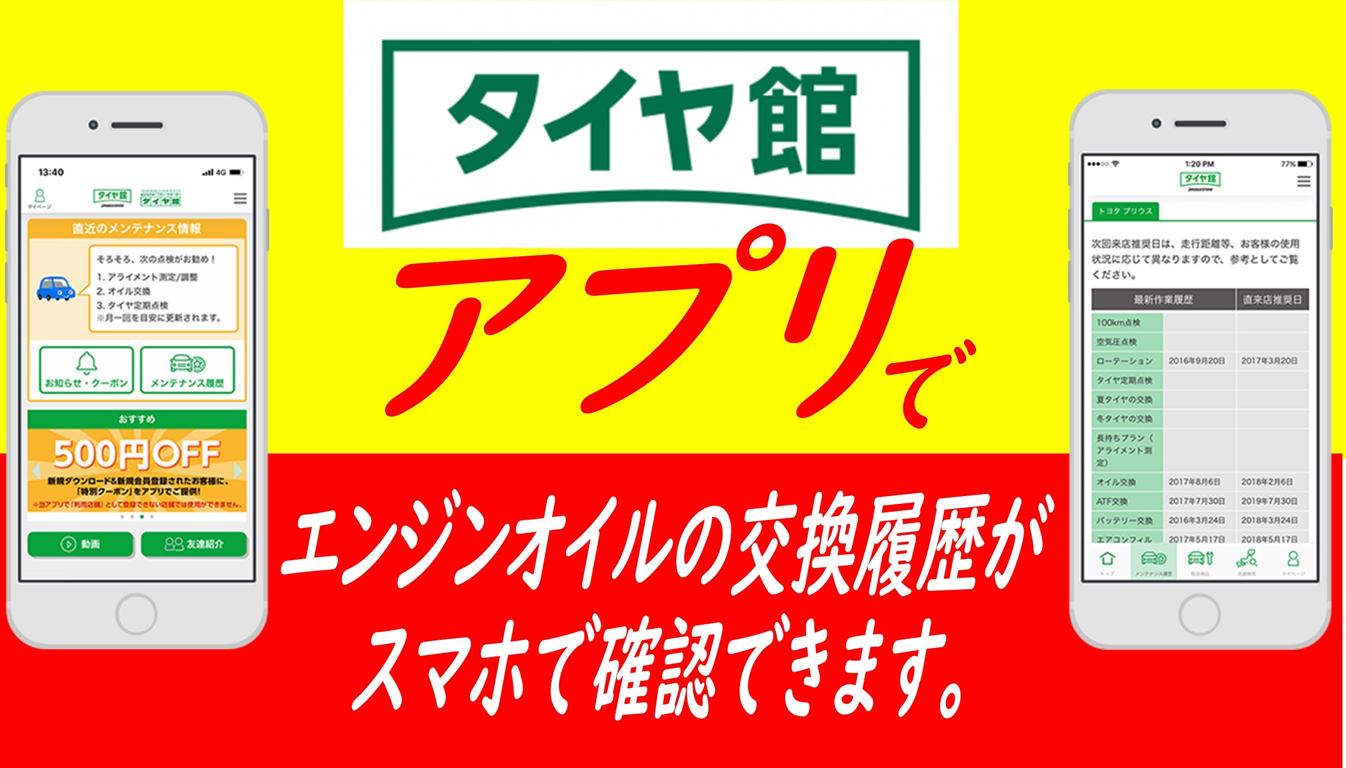 タイヤ館アプリは、定期的なクーポンのご案内だけでなく、タイヤ館で作業したオイル交換などのメンテナンスの実施履歴が確認できたり、作業の予約もスムーズに行えるとっても便利なアプリです。