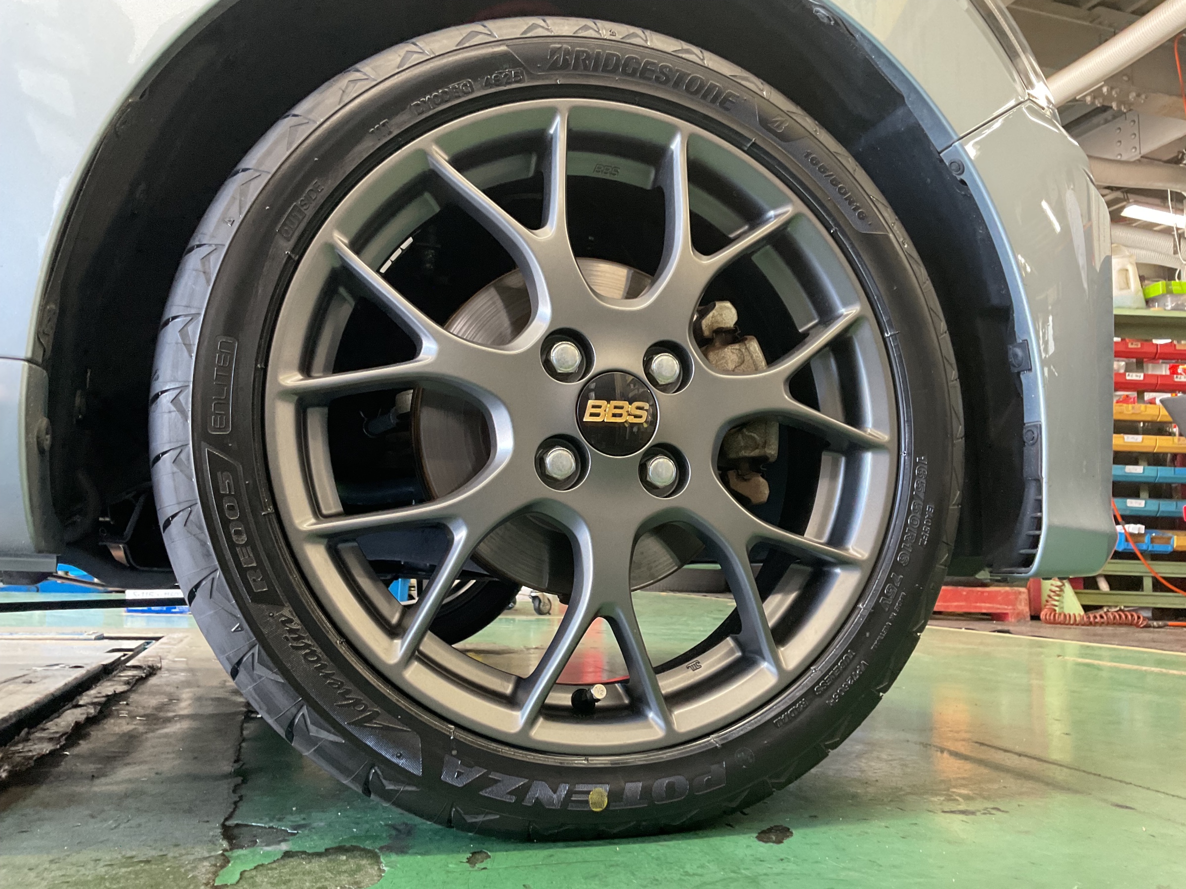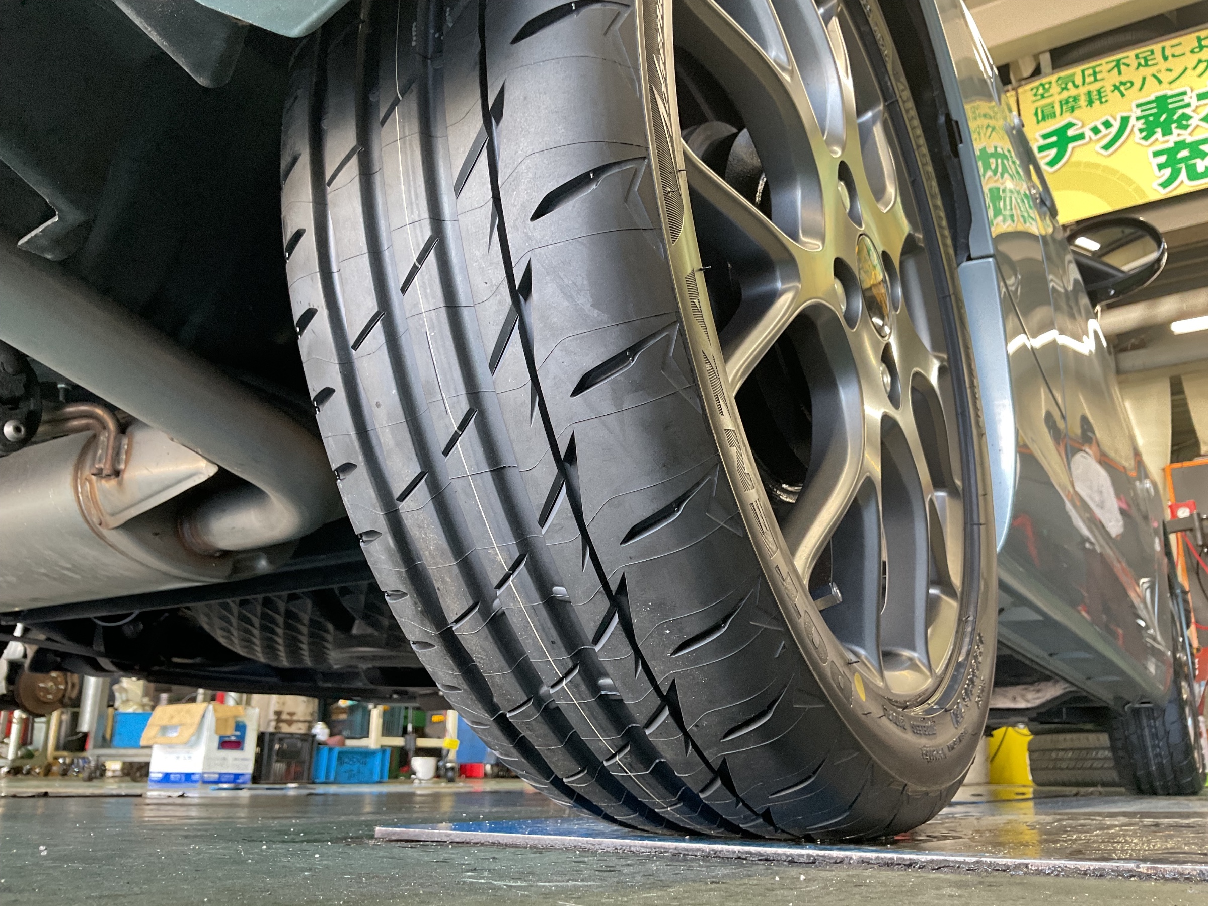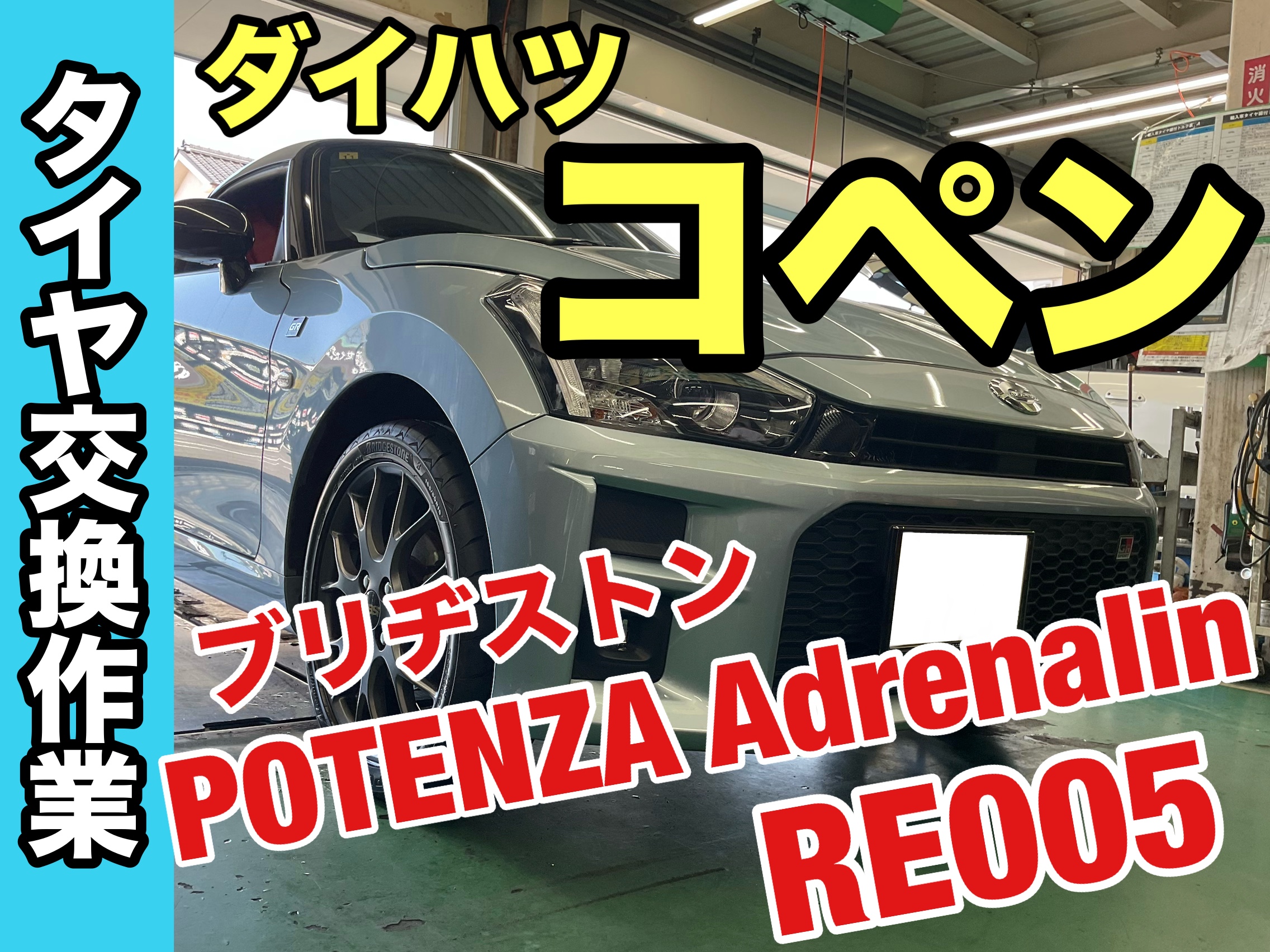 コペンのタイヤ交換作業です。ブリヂストンのスポーツタイヤブランド「POTENZA(ポテンザ)」の中の、2026年新発売の「Adrenalin RE005(アドレナリン)」を装着させていただきました。