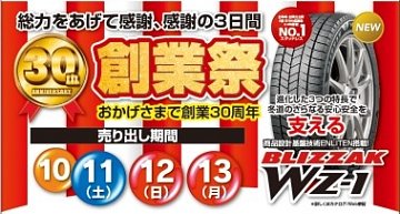 おかげさまでタイヤ館アオエは今年で30周年を迎えることができました!本日10/11(土)~10/13(月)の3日間は年に一度のお祭り騒ぎ♪スタッドレスタイヤはもちろん夏タイヤ、アルミホイール、カスタマイズ、メンテナンス、がとってもお買い得なこの期間が一番の大チャンス!ぜひお気軽に遊びに来てくだ...