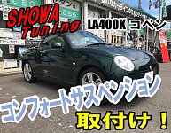 まいどさまです! いつも当店ホームページをご覧いただきありがとうございます♪ 今日の作業紹介はLA400Kコペンの足回り交換です♪ 今回お取付けしたのは・・・ 「SHOWA Tuning コンフォート」 純正でビルシュタイン製の足回りが装着されていましたが、「どうも乗り心地が硬過ぎるのでもう少し柔らか...