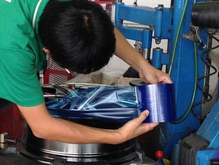 新品のホイールをキズ付けないようにマスキングをして丁寧に組んでいきます。。。