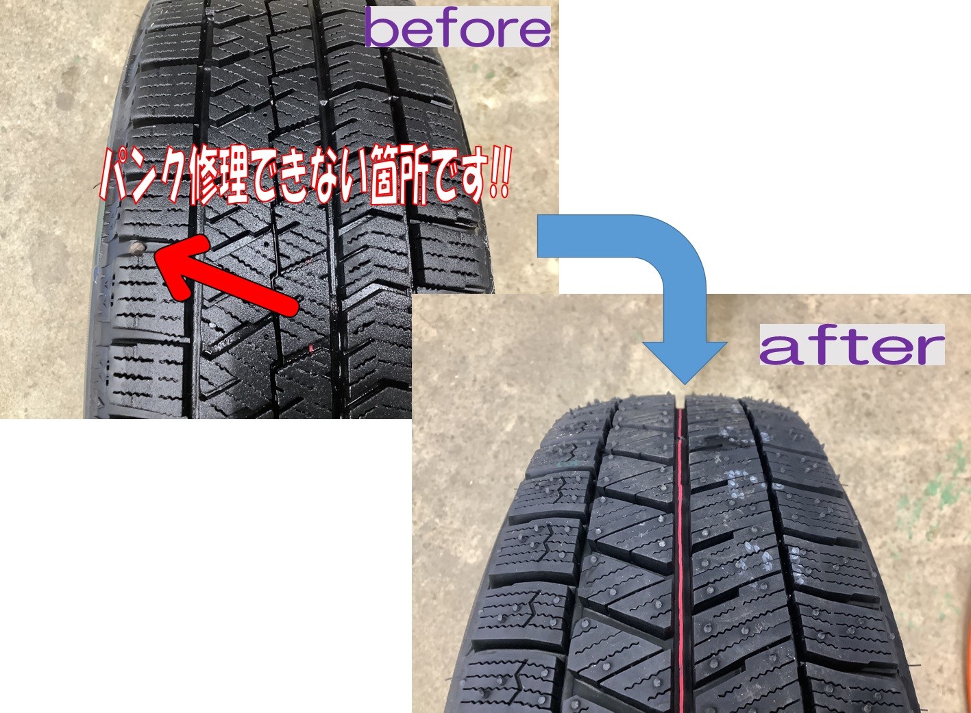 点検するとパンクが発覚!!他タイヤも交換時期だった為、
