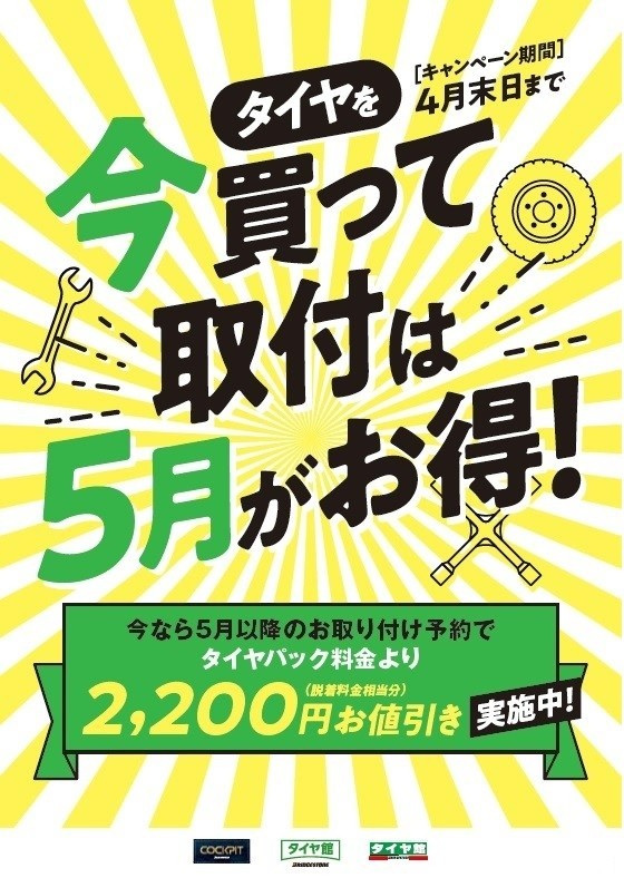 ☆5月☆取付キャンペーン!!残り日数わずか、、 ポスト 2024年4月27日 いつもタイヤ館青森中央のWEBをご覧頂きありがとうございます 5月割りキャンペーン 4月中にご購入頂いたタイヤを5月にお取り付け予約のお客様を対象に タイヤパック料金より2,200円(脱着料金相当分)お値引き致します!! タイヤ交換をお急ぎで無いお客様は是非ご検討下さい!! ご来店、ご相談お待ち致しております!! 残り日数が少なくなってます!お早めに! ※開催期間 4月30日迄 担当:渡辺