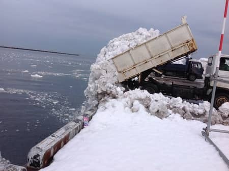 ダンプに積み込んだ雪は、堤埠頭の海まで捨てに行きます!