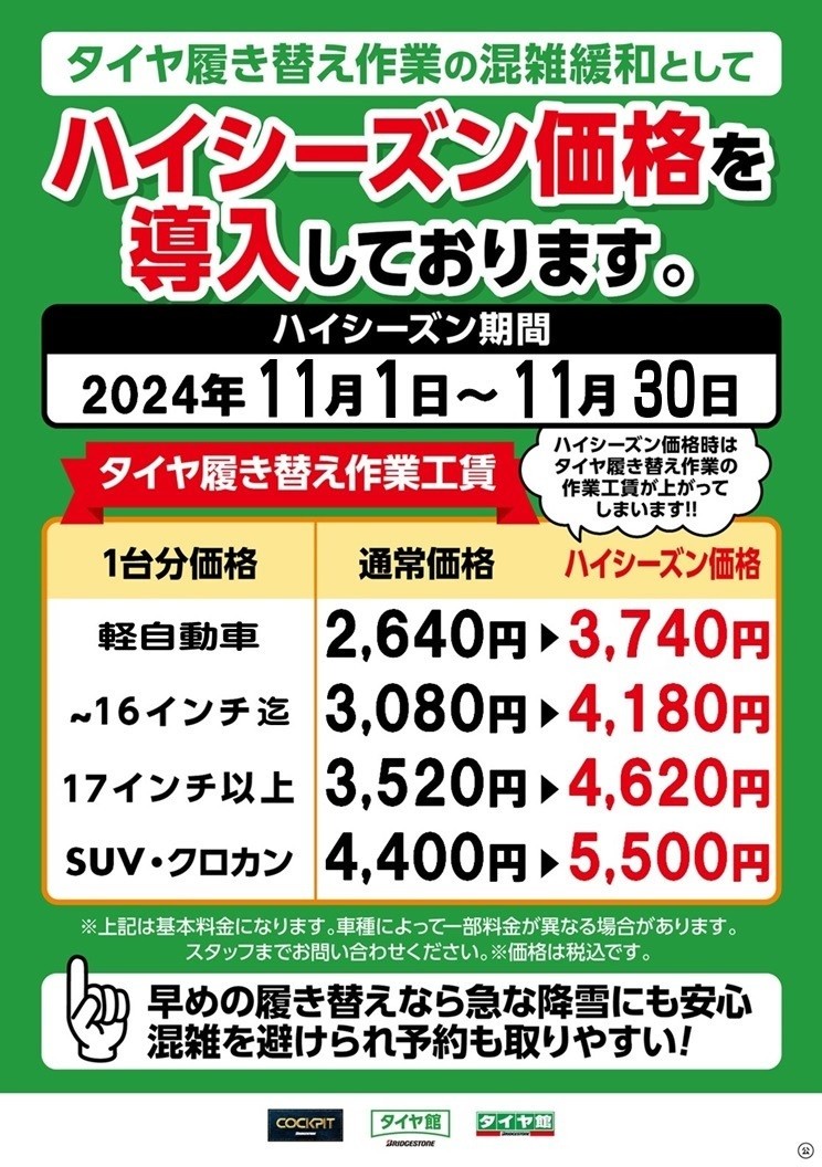 タイヤ館では光熱費(電気代等)の高騰と、タイヤ履き替え作業の混雑緩和の為、