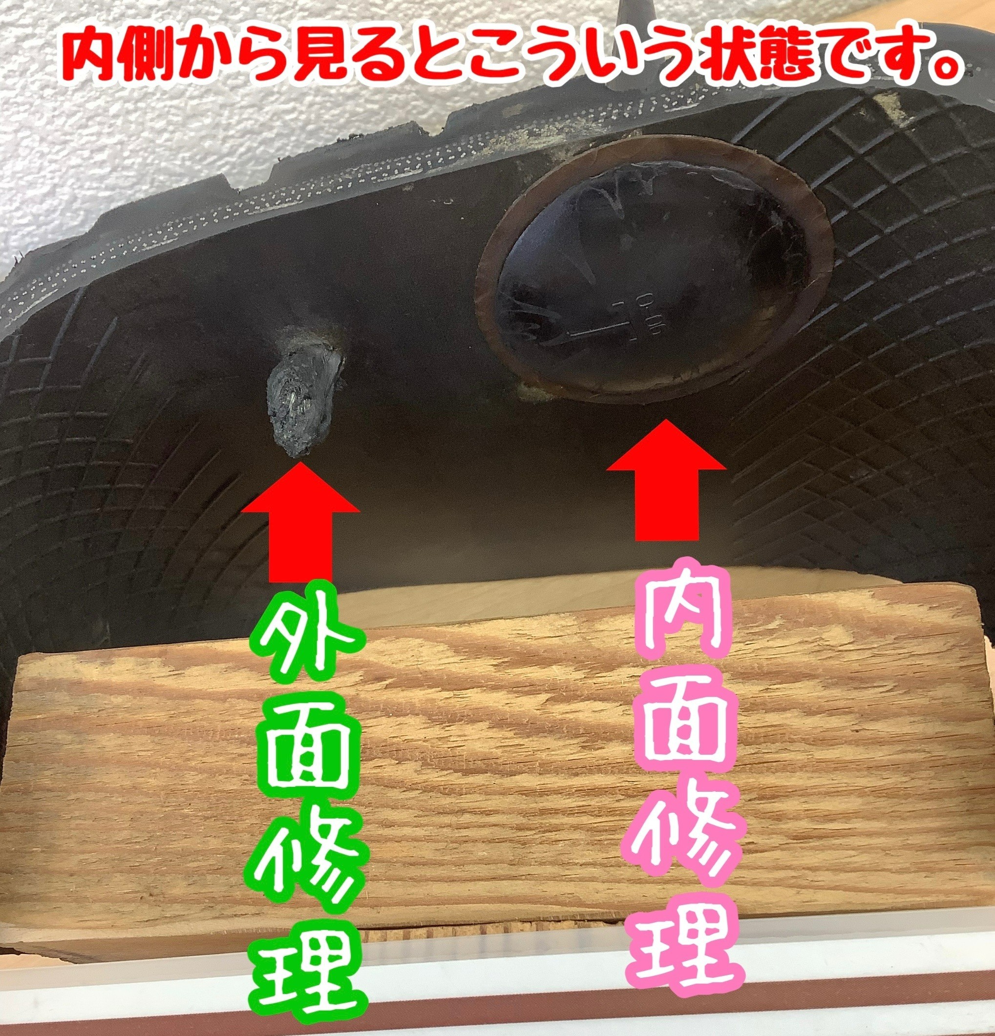● タイヤを外して内側から修理材を打ち貼りして修理する