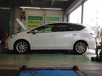 今日は車高調の取り付けです(o^^o) お車はプリウスαのノーマル^ - ^ やはり車高が高いっすねー>_