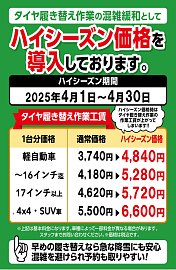 【 重要 】ハイシーズンタイヤ脱着工賃についてのお知らせ