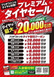 6/27(木)より 《プレミアムタイヤセール》 開催致しております!! 7/21(日)までです!!いよいよ明日までとなりました!! たくさんのご来店誠にありがとうございます。(>_<) コクピット・タイヤ館のアプリをダウンロード頂いた方全員に、 ブリヂストンのタイヤ割引クーポンをプレゼント! ブリヂ...