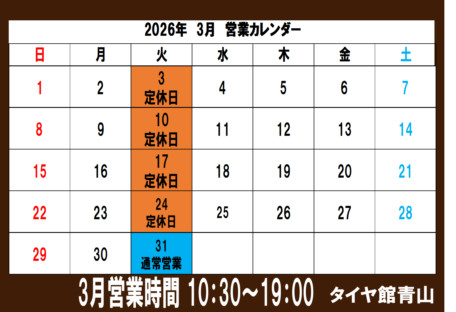 【〜タイヤ館 青山の休業日のお知らせ〜】
