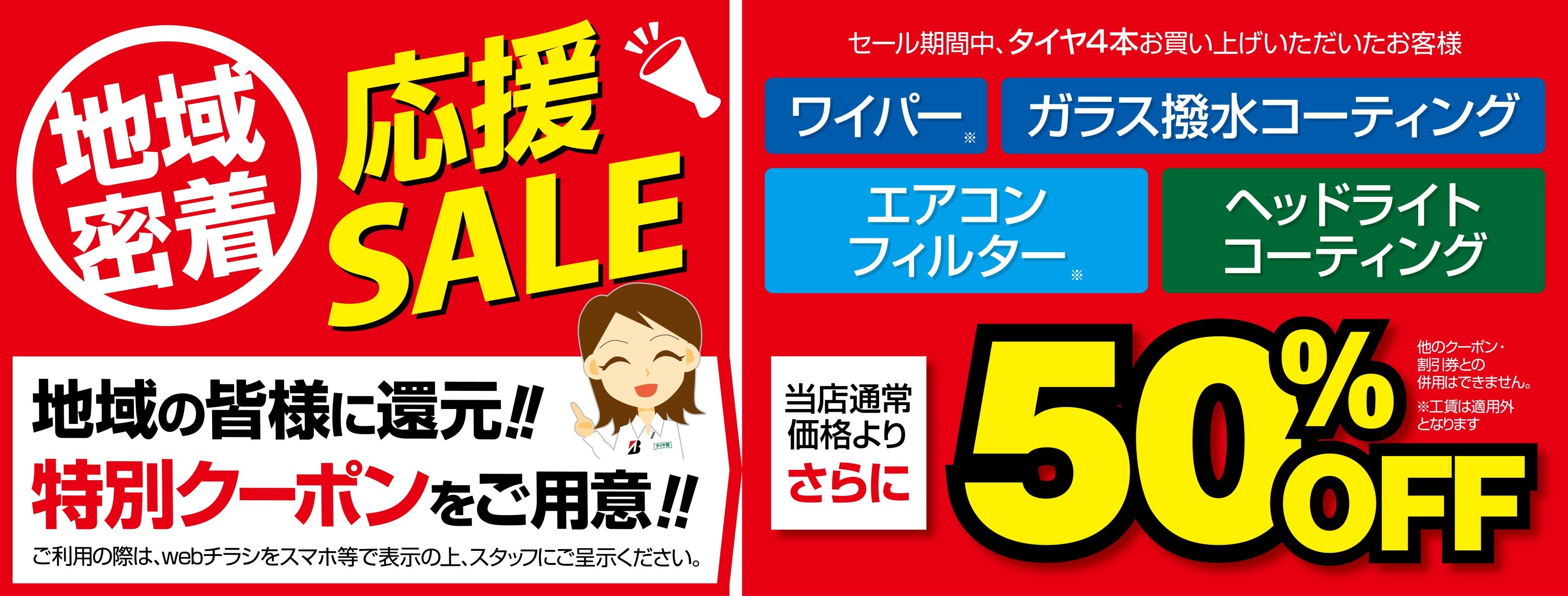 タイヤ4本ご購入で、ワイパー・エアコンフィルター・ガラス撥水コーティング・