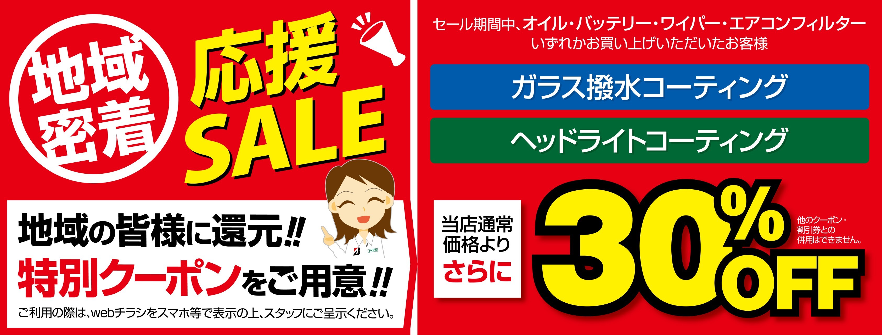 期間中、エンジンオイル・バッテリー・ワイパー・エアコンフィルターご購入で、