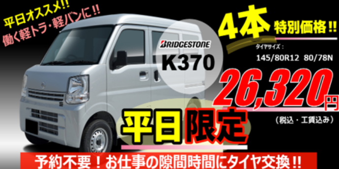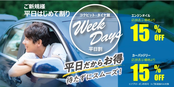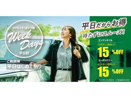 コクピット・タイヤ館は“平日”がお得!『平日割』実施中!