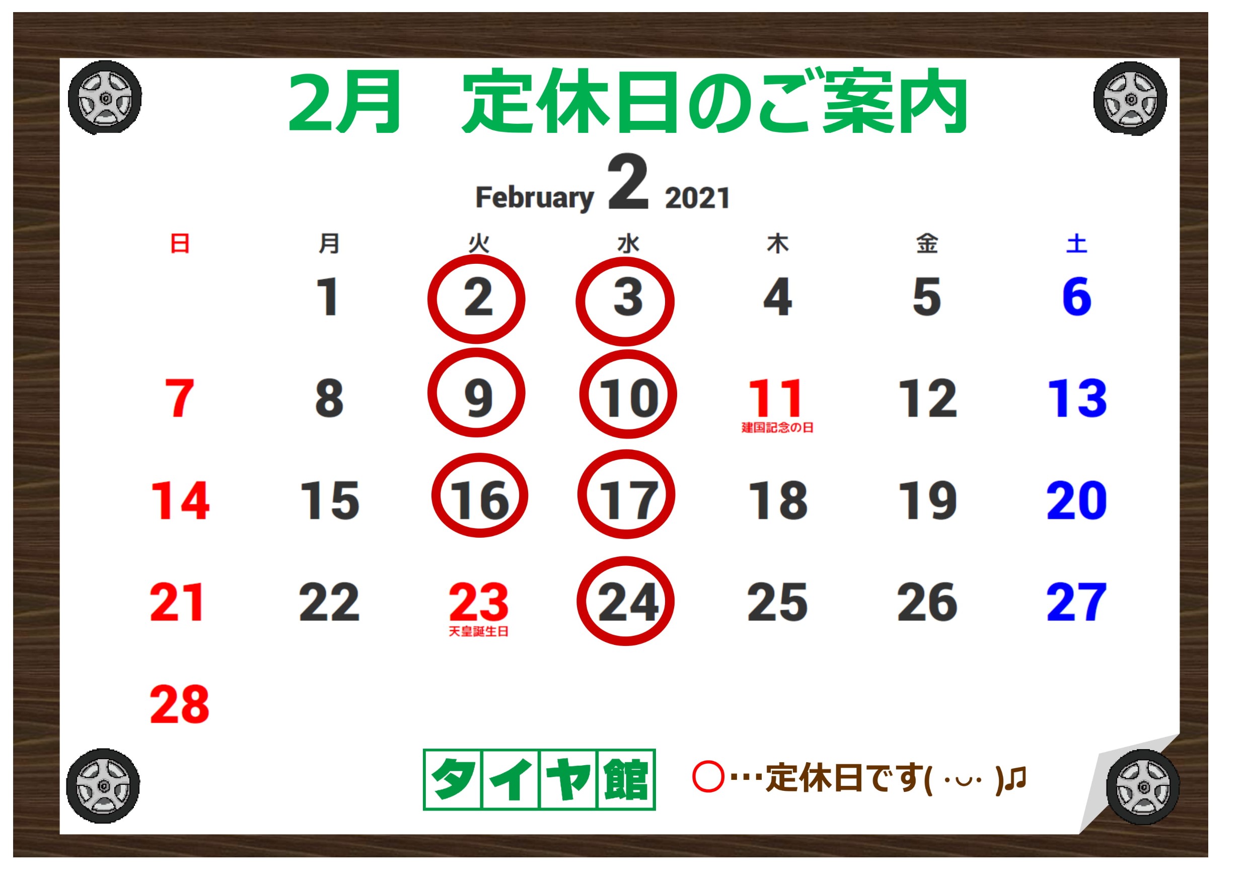 2月の定休日のご案内です。