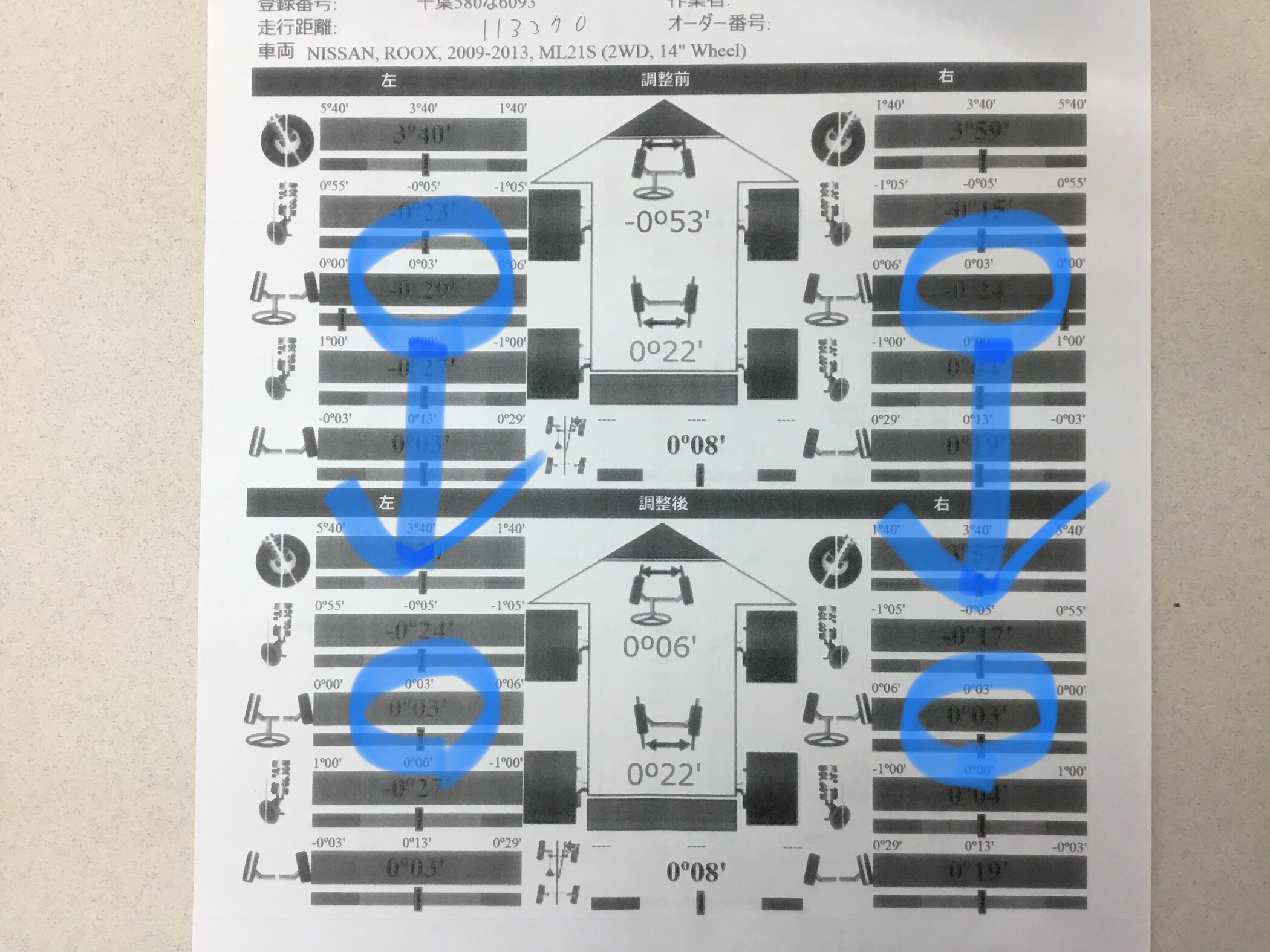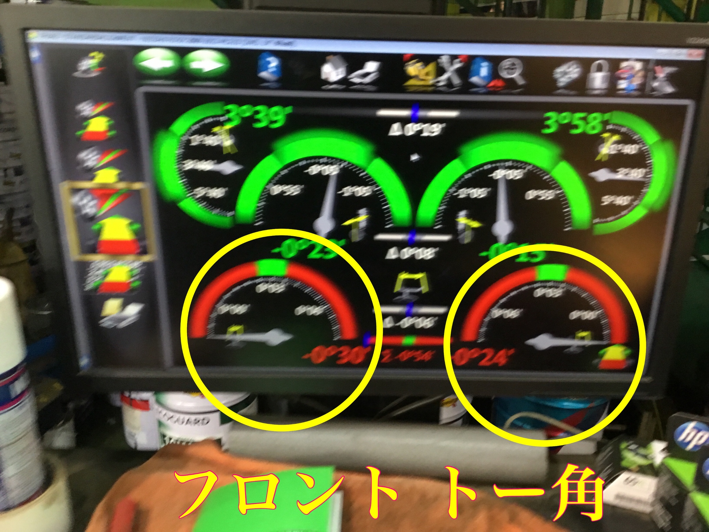 フロントのトー角(人間の足でいう内股、がに股)ががに股の状態で