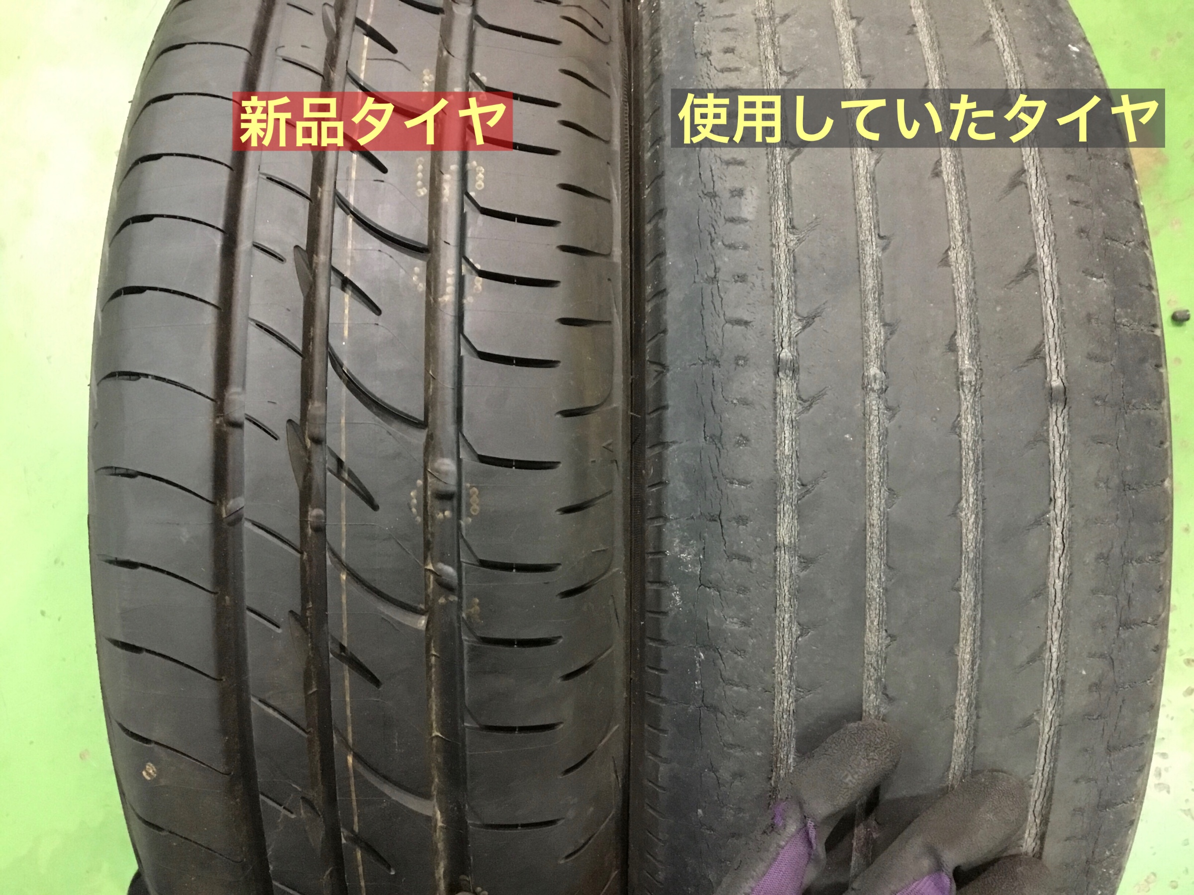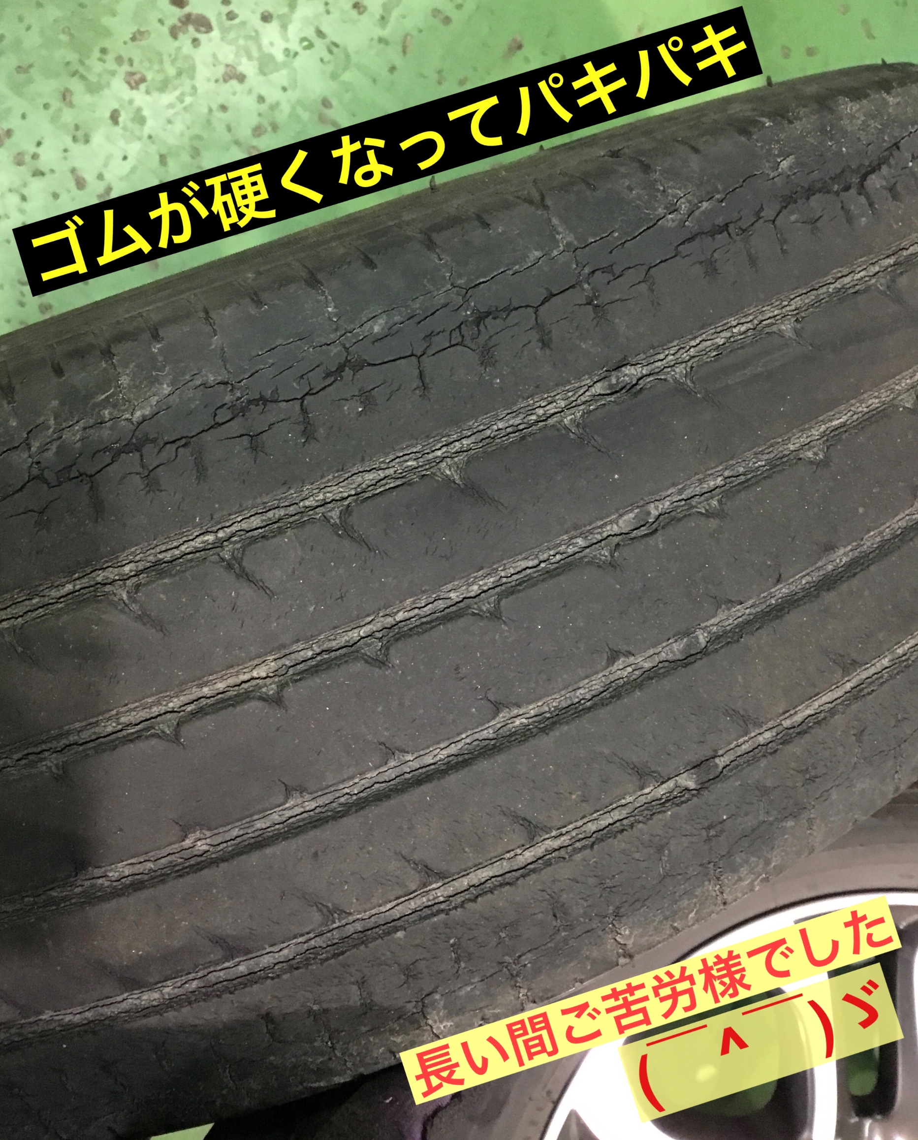 いままでのタイヤは、スタッドレスタイヤとの併用により、かなり長くご利用いただいており、約6年程経過しておりました!