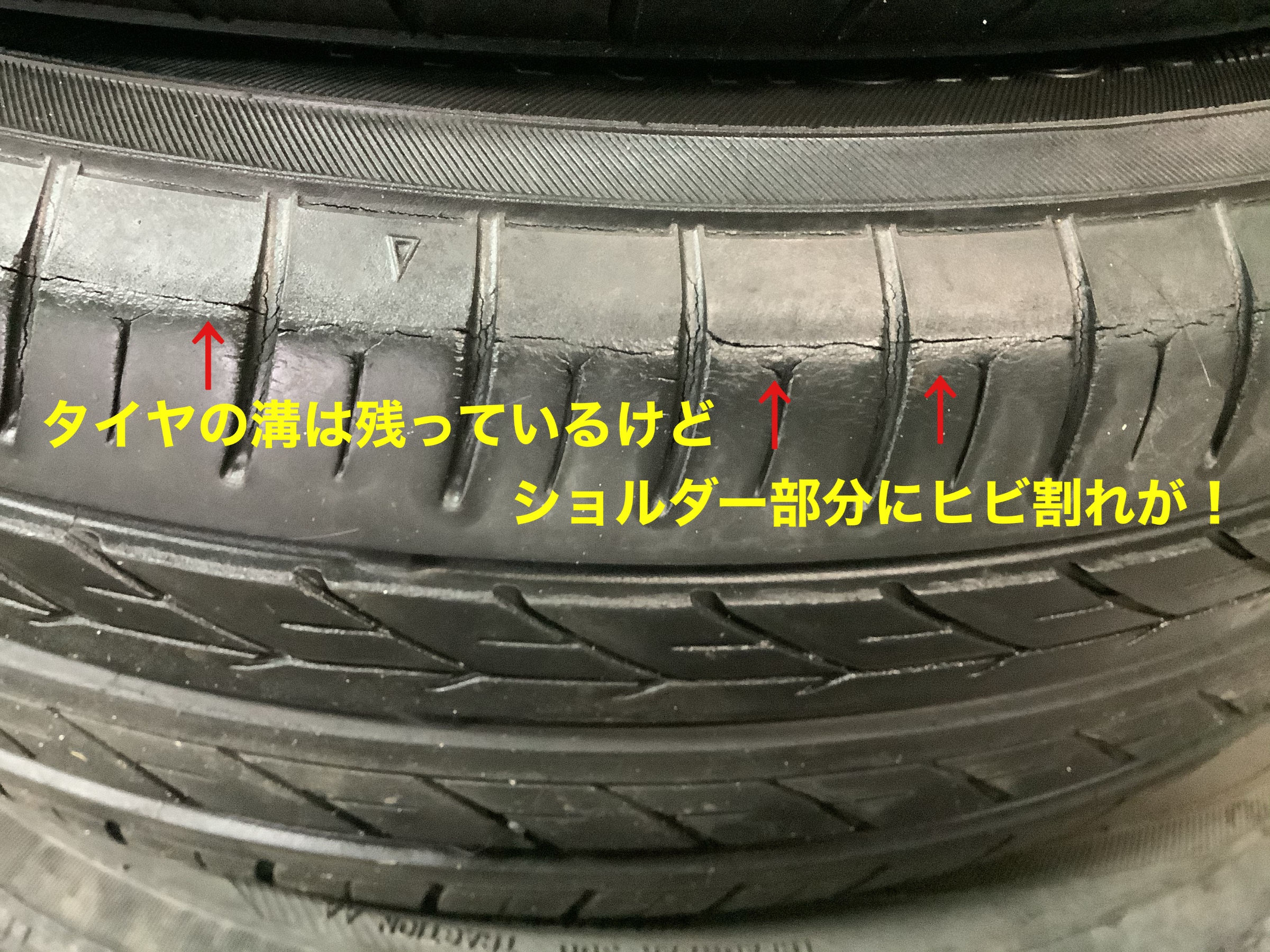 溝は残っているのですが、タイヤが路面に設置したところの端(ショルダー)のヒビ割れがたくさん出てきておりました!