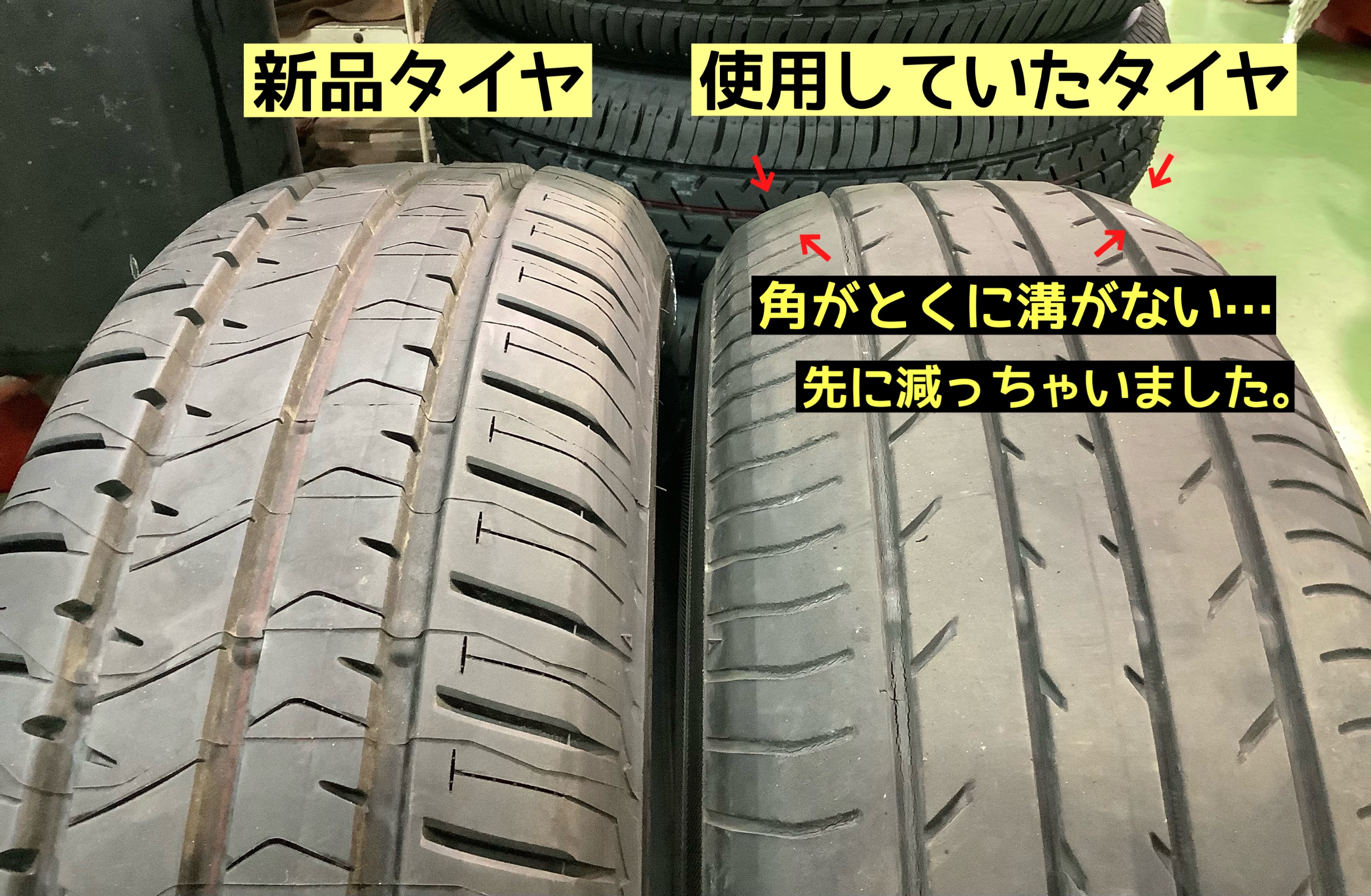 いままでのタイヤは、重心が高くふらつきやすいミニバンを支える際、部分的に強く力がかかり、タイヤの端(角)の部分が真ん中よりも早く溝が減ってしまっておりました。
