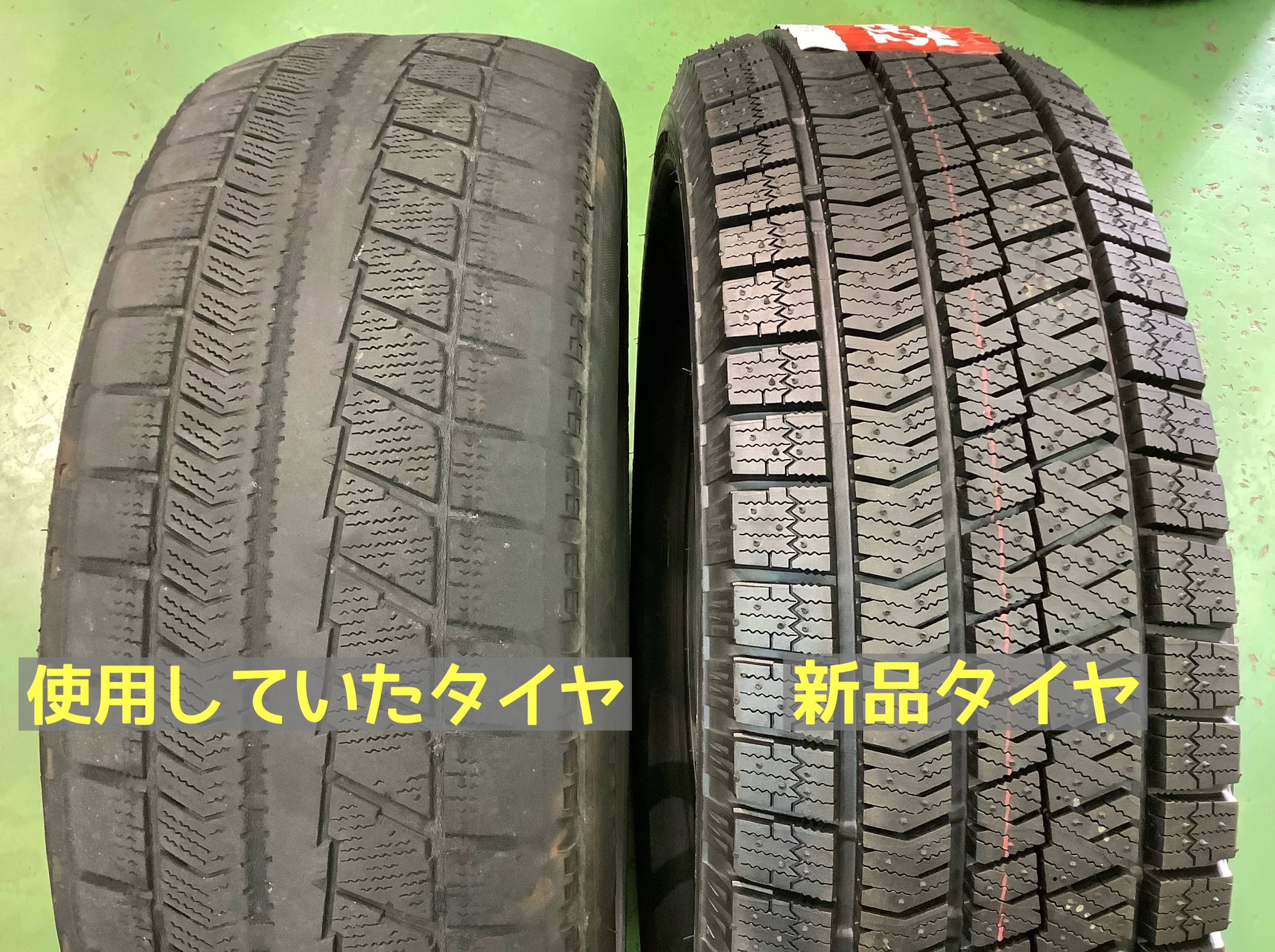 新品タイヤと比較すると、わずかに溝の残っている部分とすっかりなくなった部分と差が出ています(・д・oノ)ノ