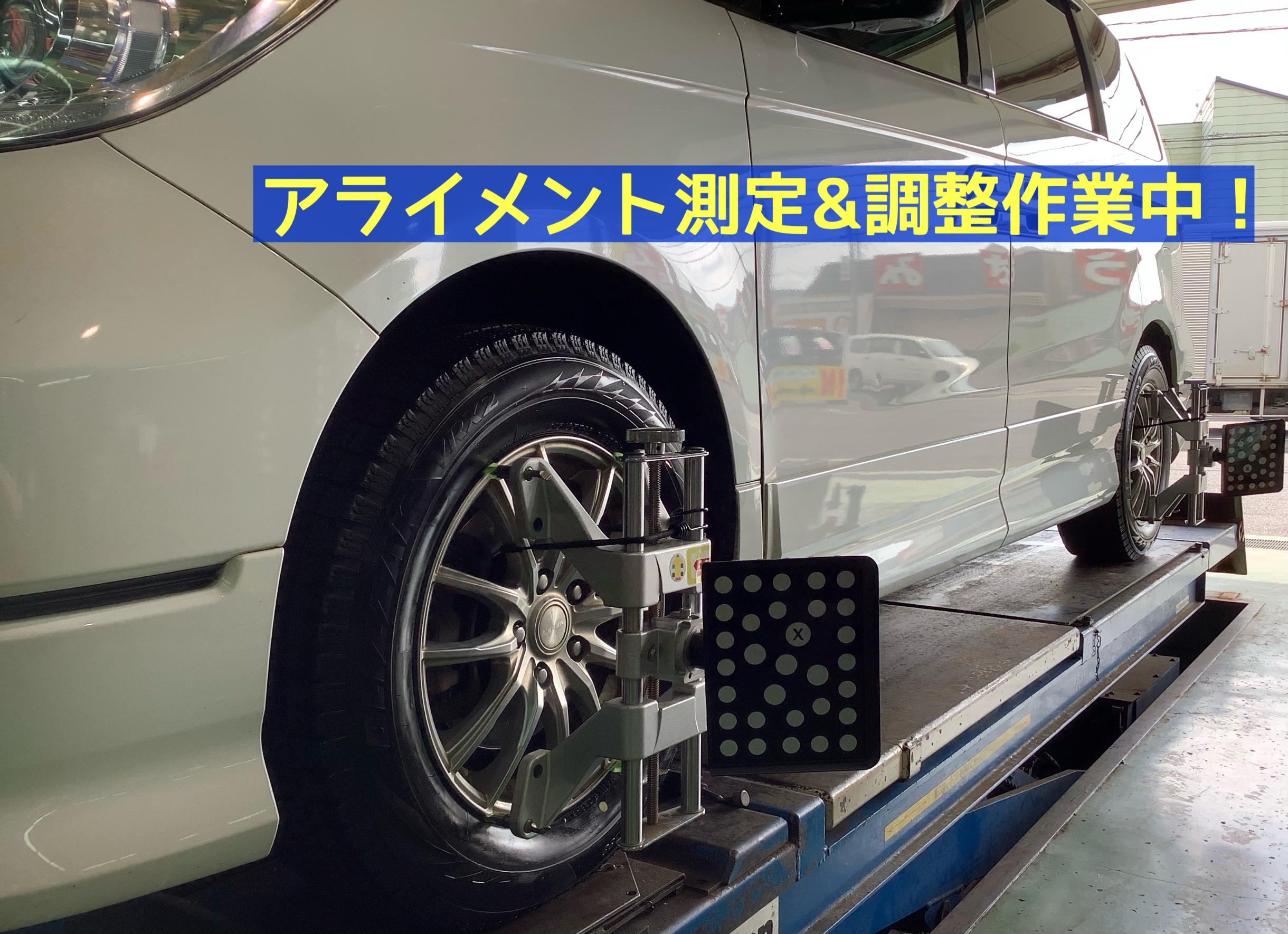 タイヤ交換の後は、偏って減ってしまっていたタイヤがまた同じようにならず、長くお使いいただくために、タイヤの向き・角度を測定するセンサーを装着し、ズレを調整させていただき、終了でございますd(`・∀・)b