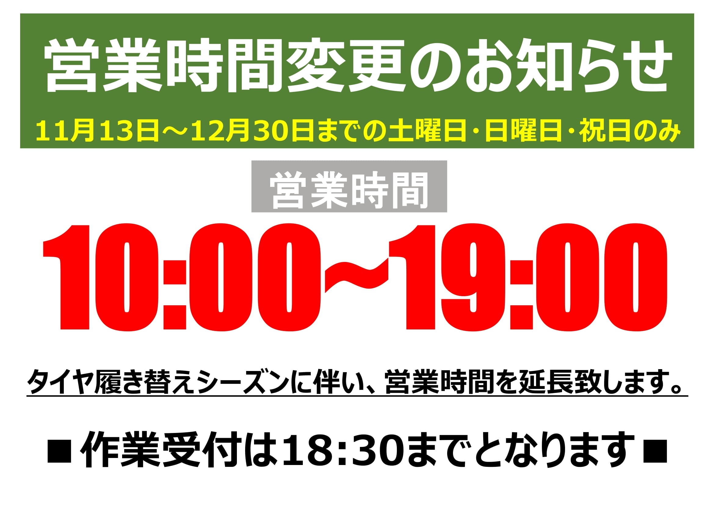 スタッドレスタイヤ履き替えシーズンに伴い、営業時間を延長致します。