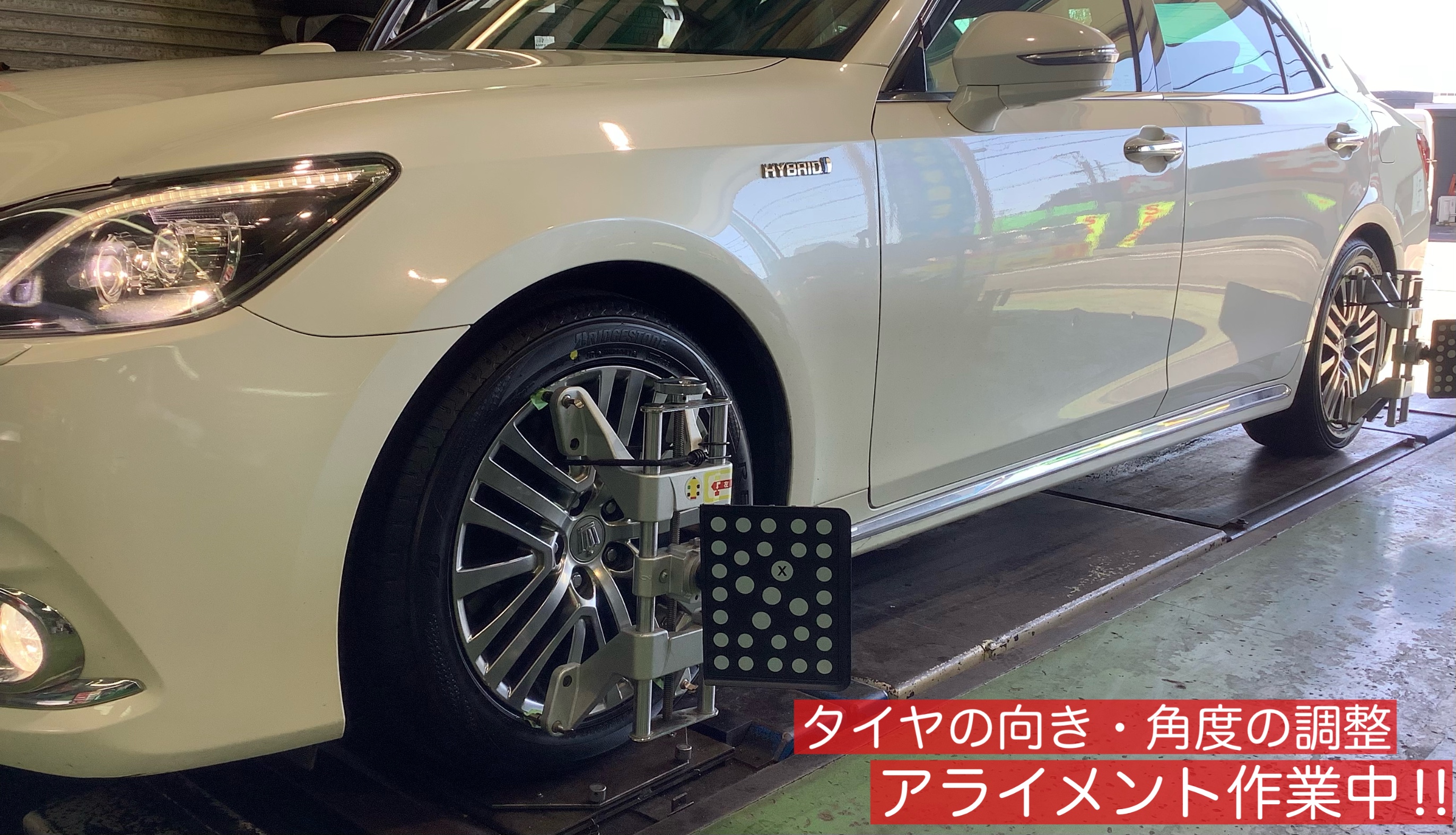 タイヤ交換の後は、新しいタイヤを長くお使いいただくために、タイヤの向き・角度を測定するセンサーを装着し、ズレを調整させていただき、終了でございますd(`・∀・)b