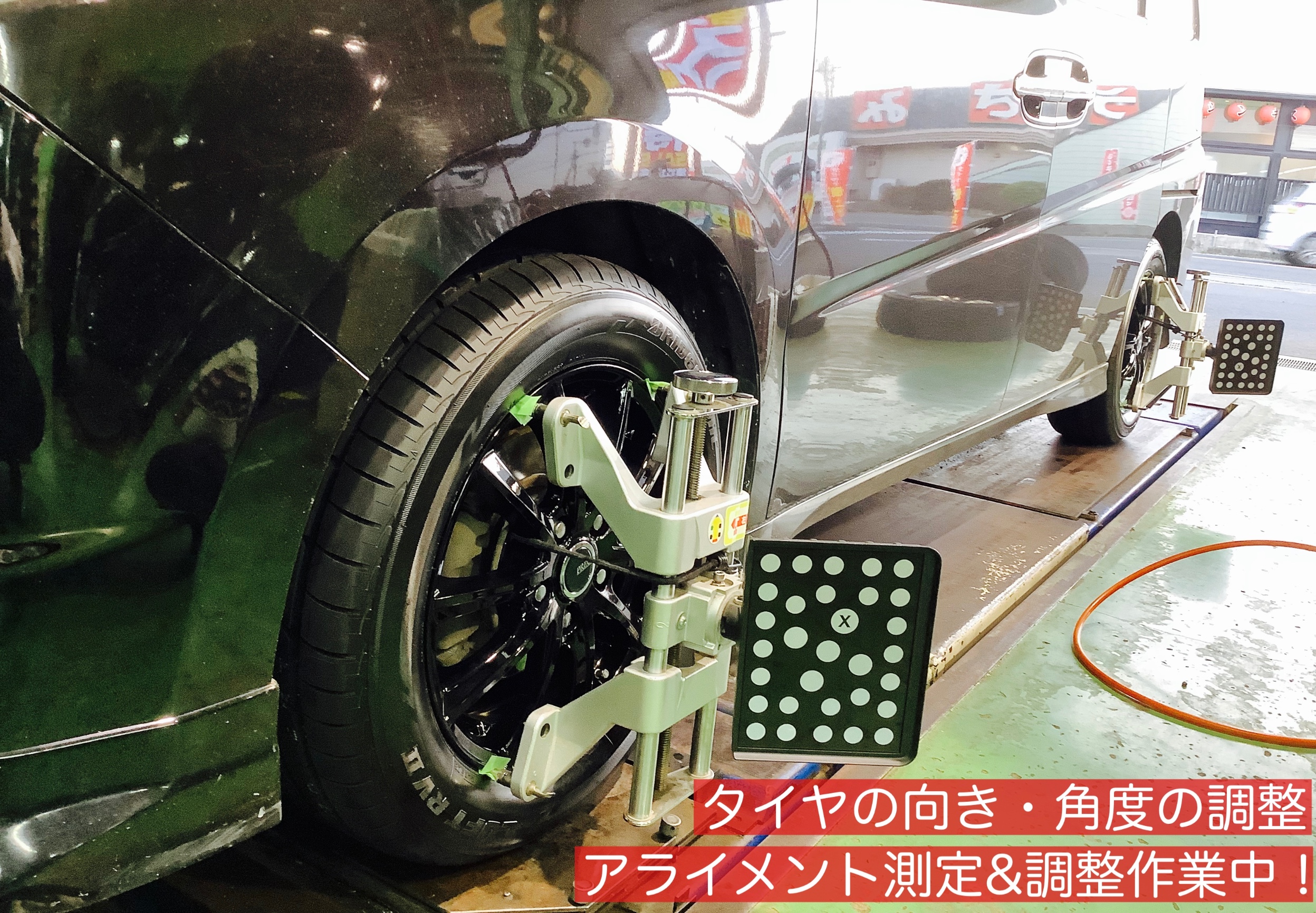 タイヤ交換の後は、新しいタイヤを長くお使いいただくために、タイヤの向き・角度を測定するセンサーを装着し、ズレを調整させていただき、終了でございますd(`・∀・)b