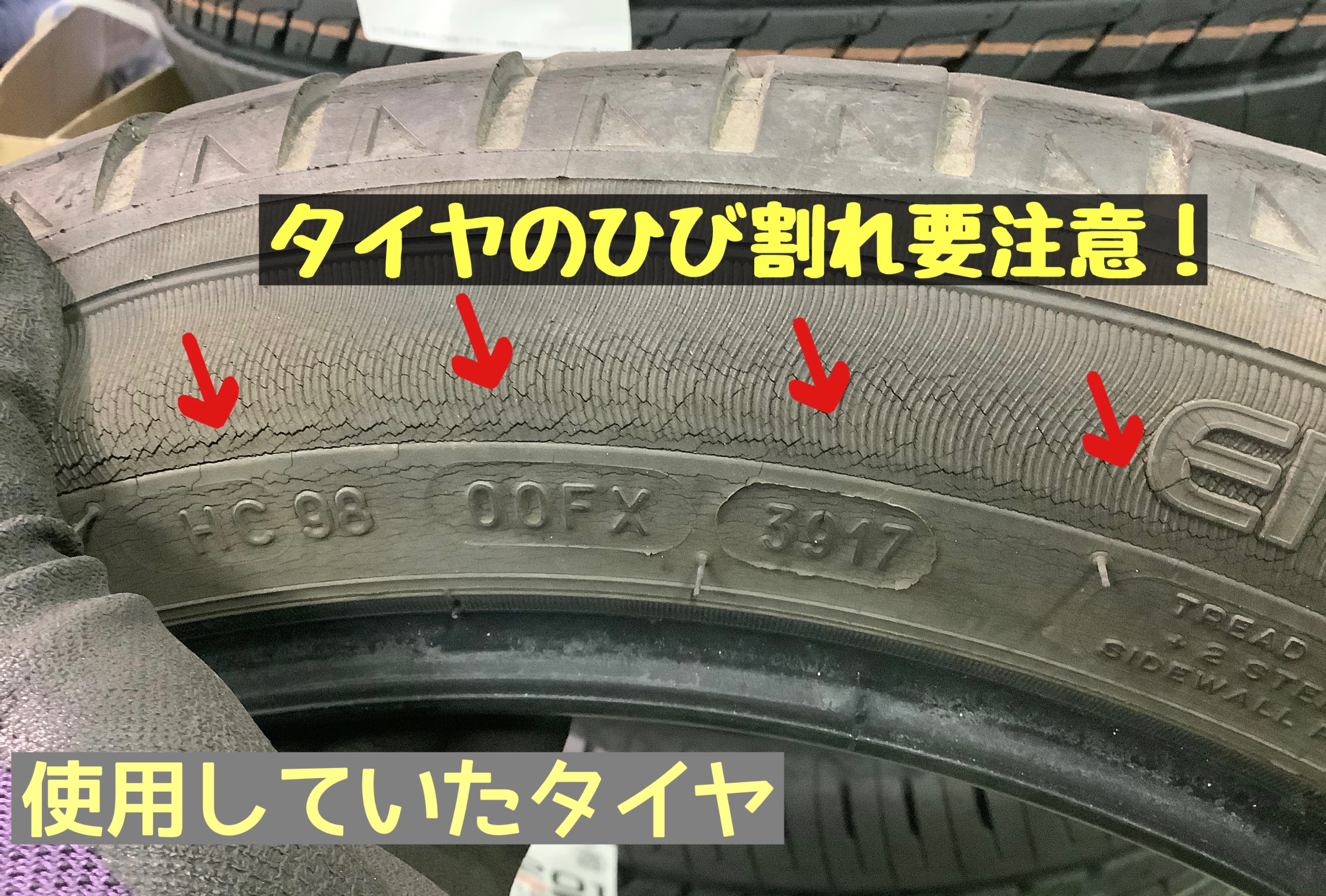 タイヤの溝は残っているのですが、側面にもヒビ割れが多く入っていたため、新品交換にお越しくださいました!