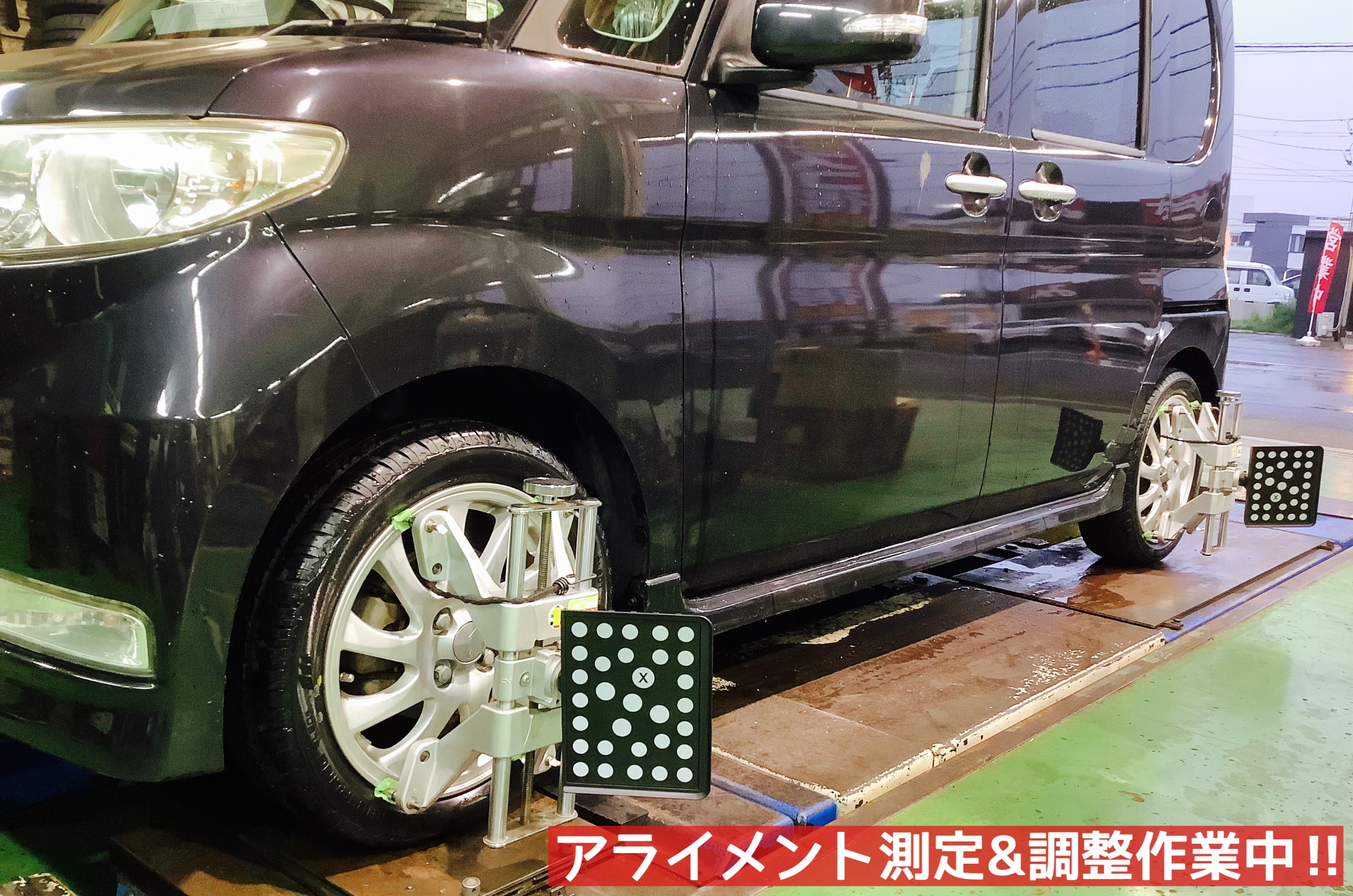タイヤの向き・角度を測定するセンサーを装着し、ズレを調整させていただき、終了でございますd(`・∀・)b