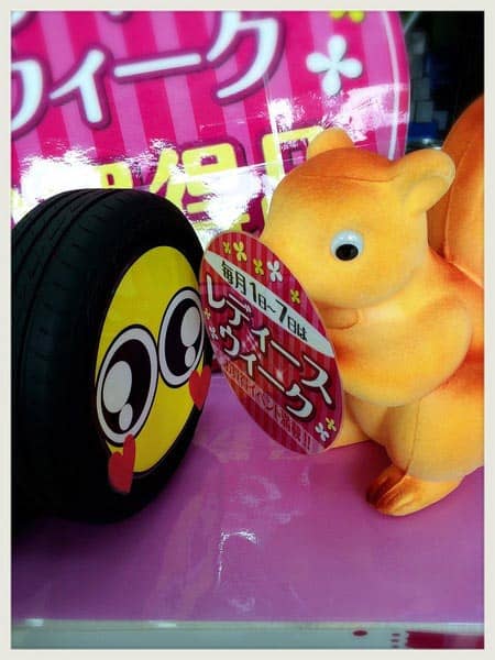 さて。本日タイヤちゃんは、秋になると登場するリスさんとひそひそ会議中。