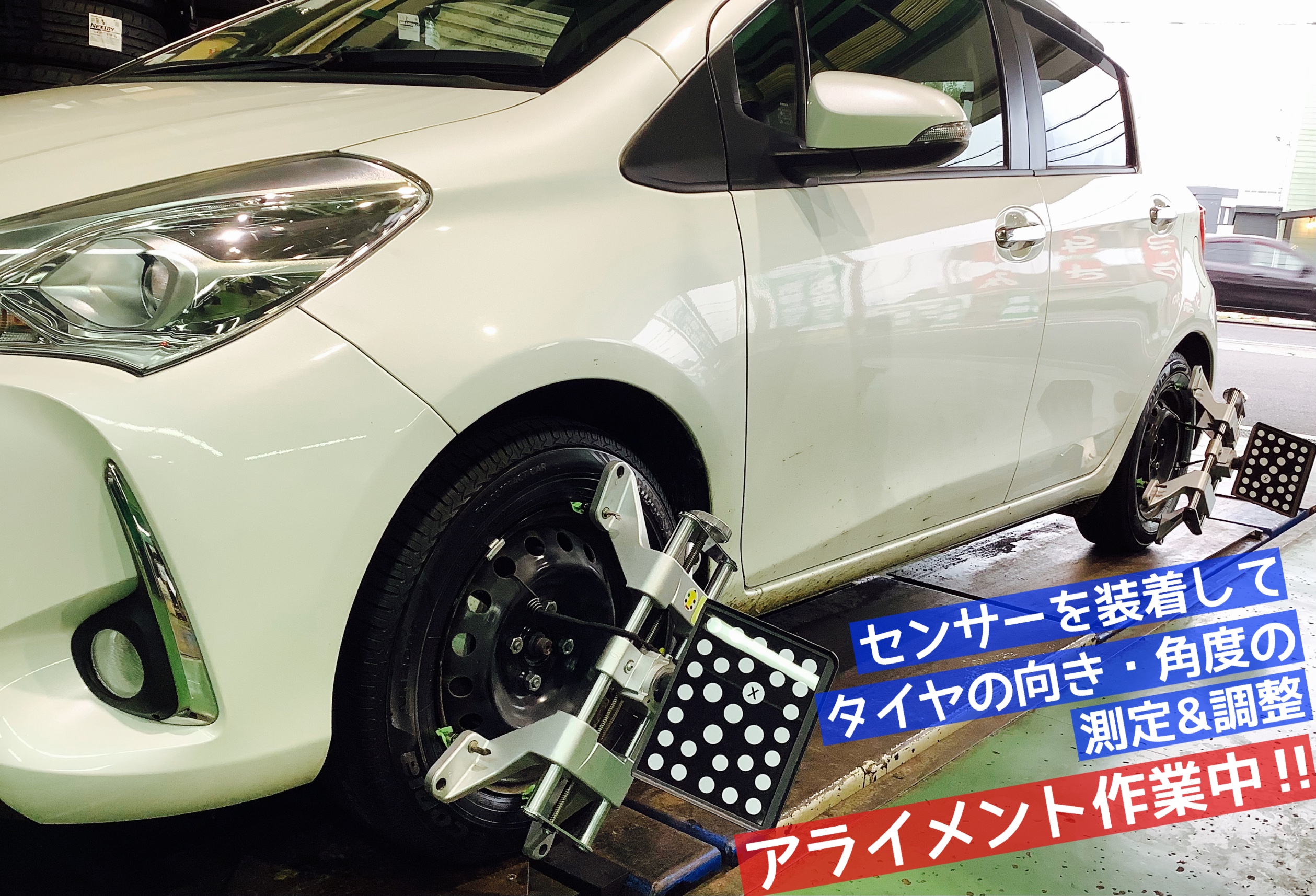 タイヤ交換の後は、新しいタイヤを長くお使い頂くため、アライメント作業を実施しました!