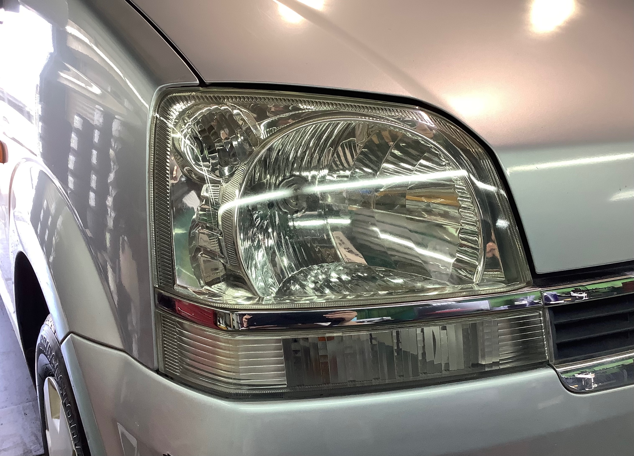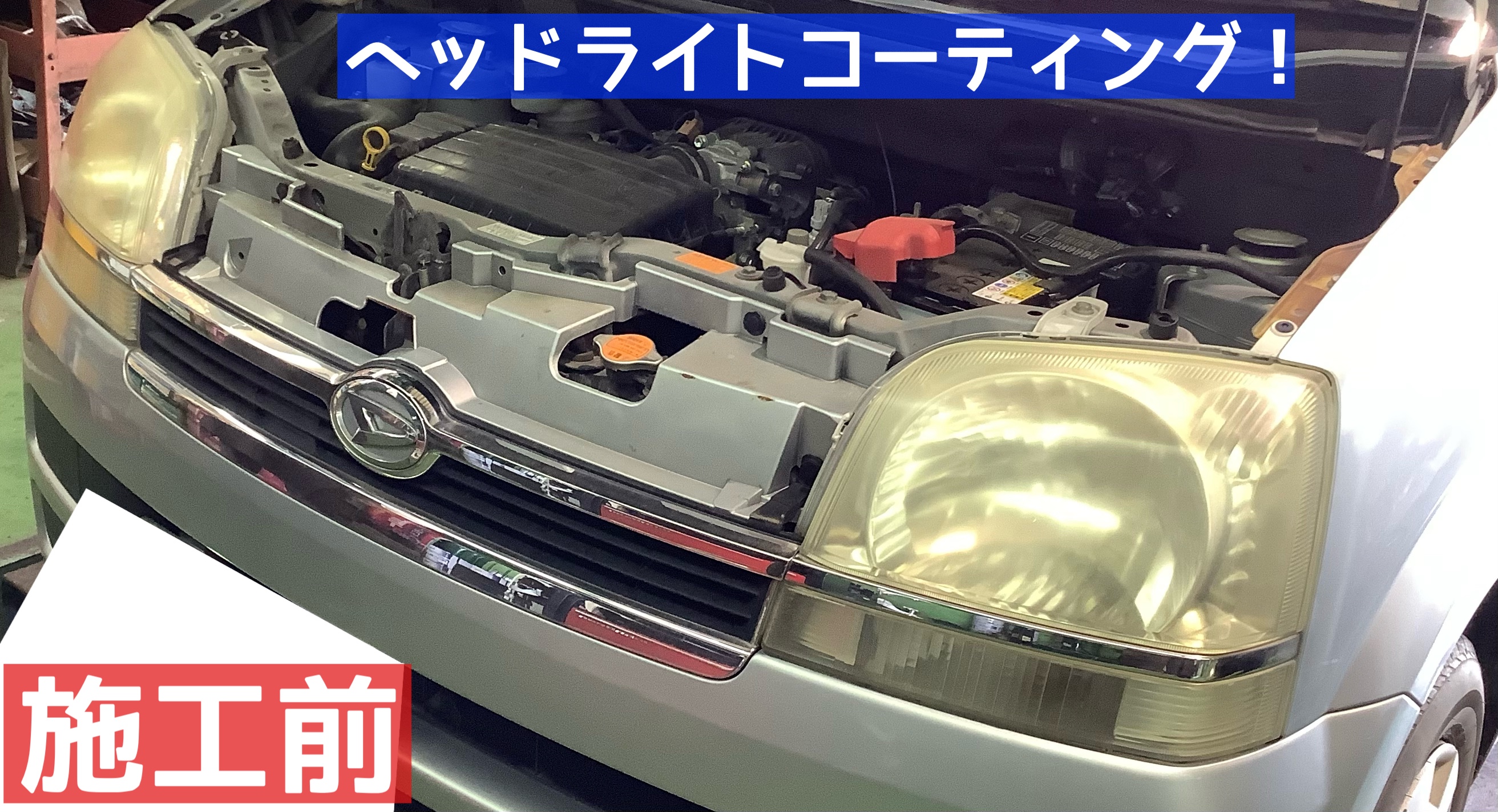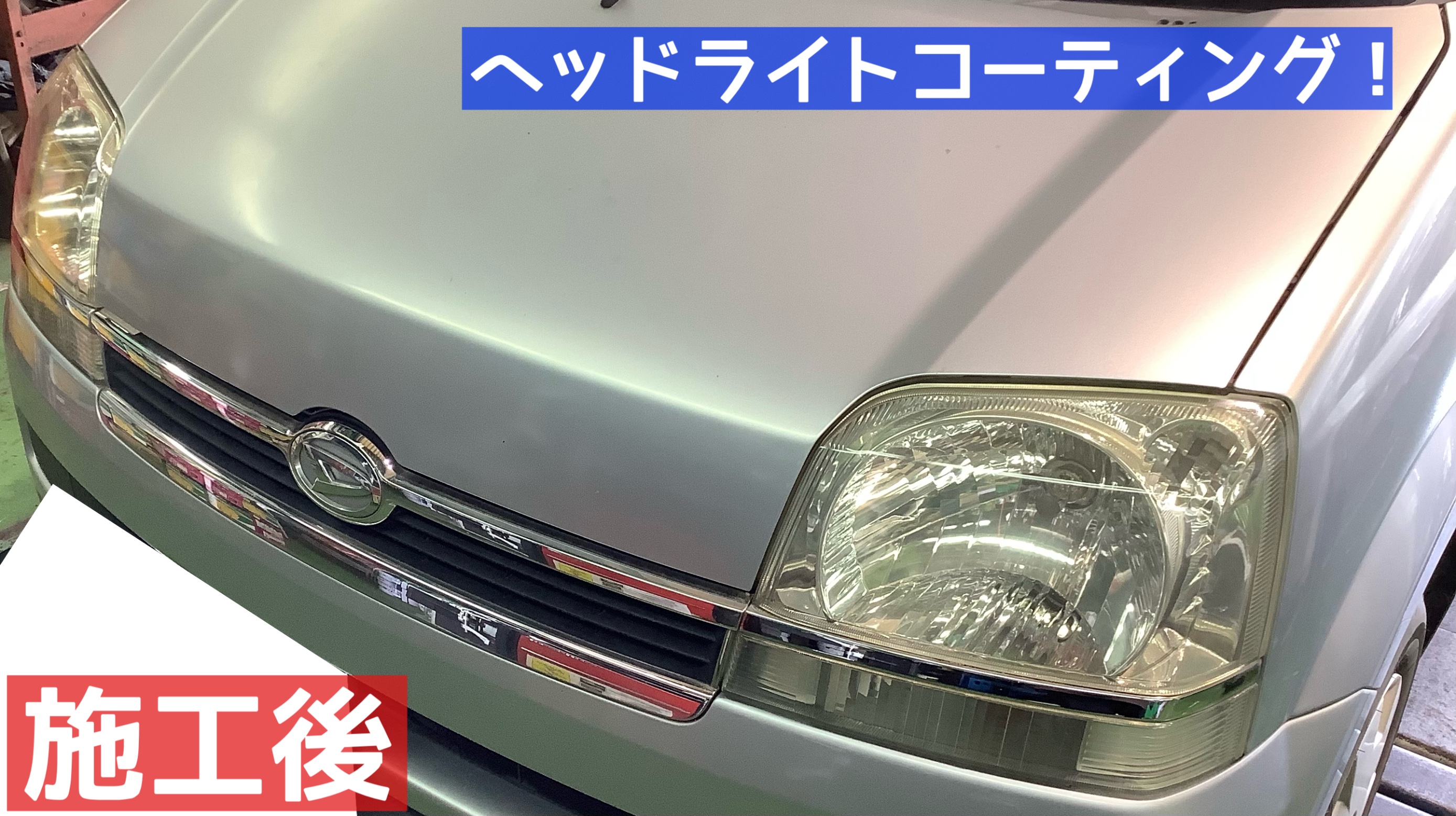 当店では、専用のベース処理剤で黄ばみやくすみを除去し、最後にコート剤で硬質被膜を形成しヘッドライトを保護する施工を行っております!