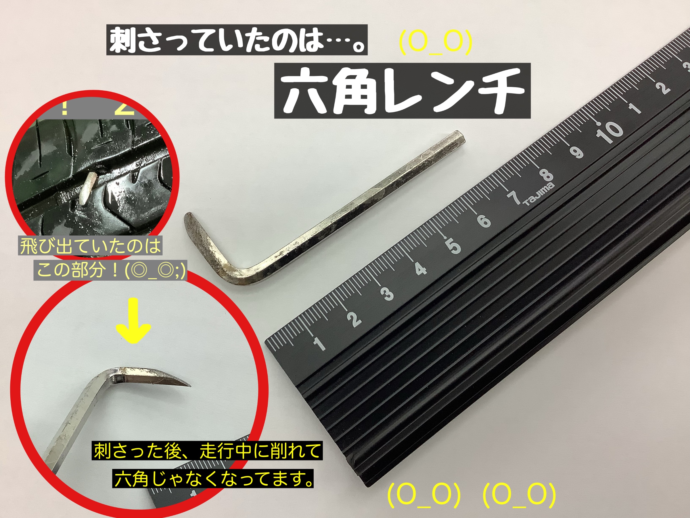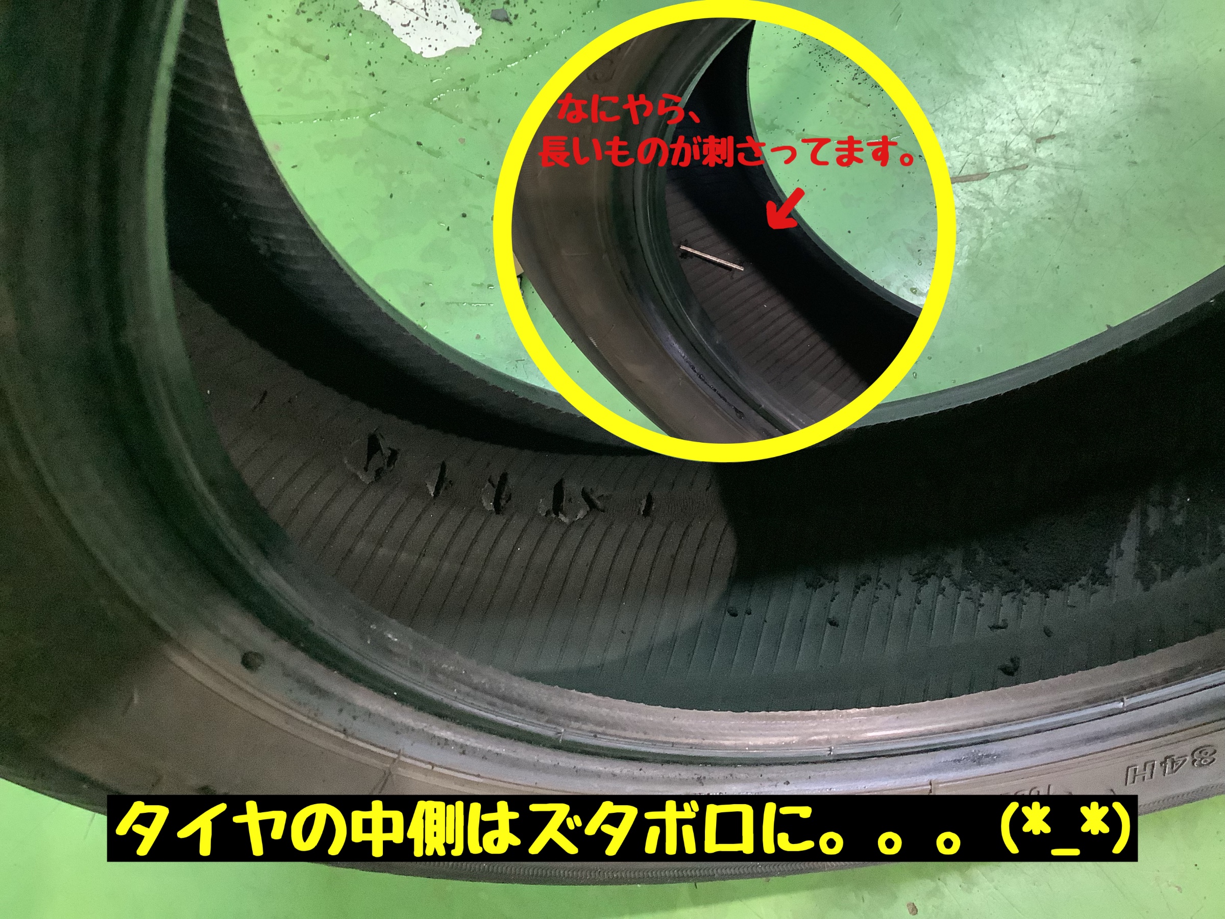 先端部分は刺さった後、走行中に路面に削られて尖ってしまったと思われます!