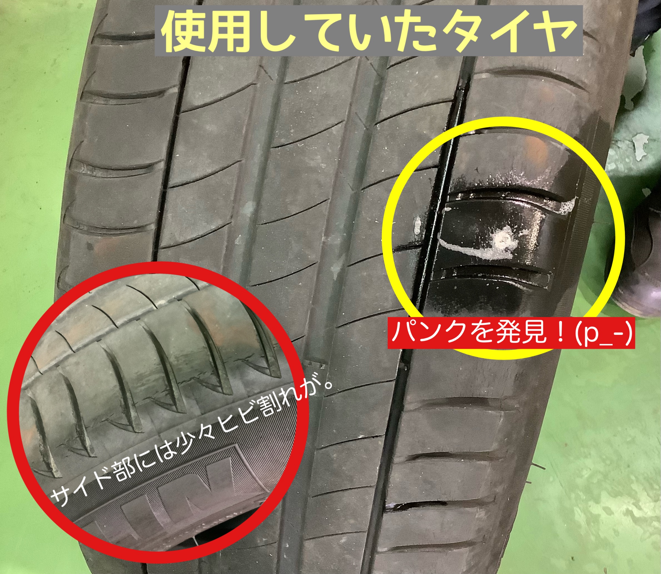 残念ながら修理を行ってのタイヤ再利用は危険な状態となっていたため、新品に交換をすることになりました。