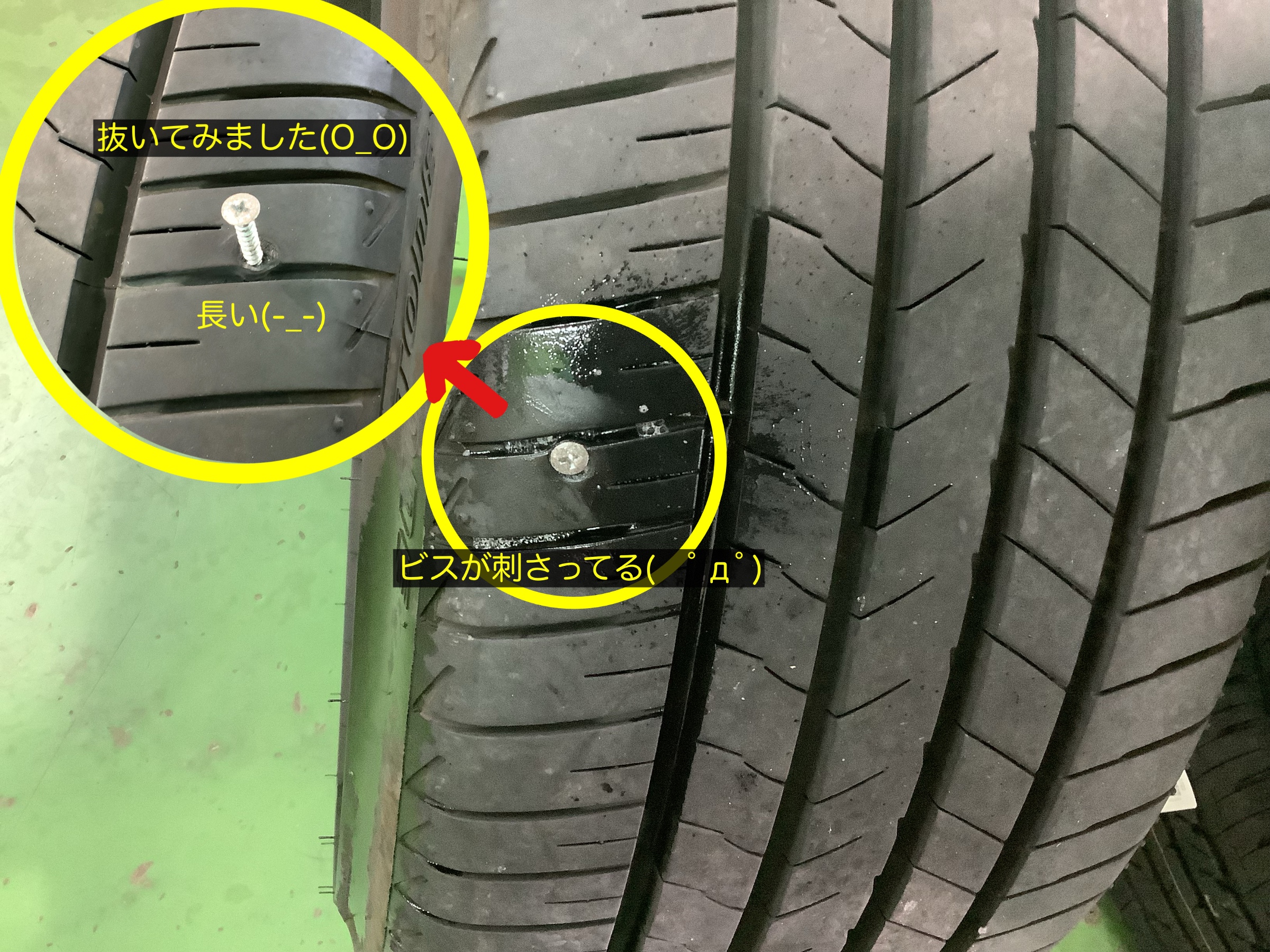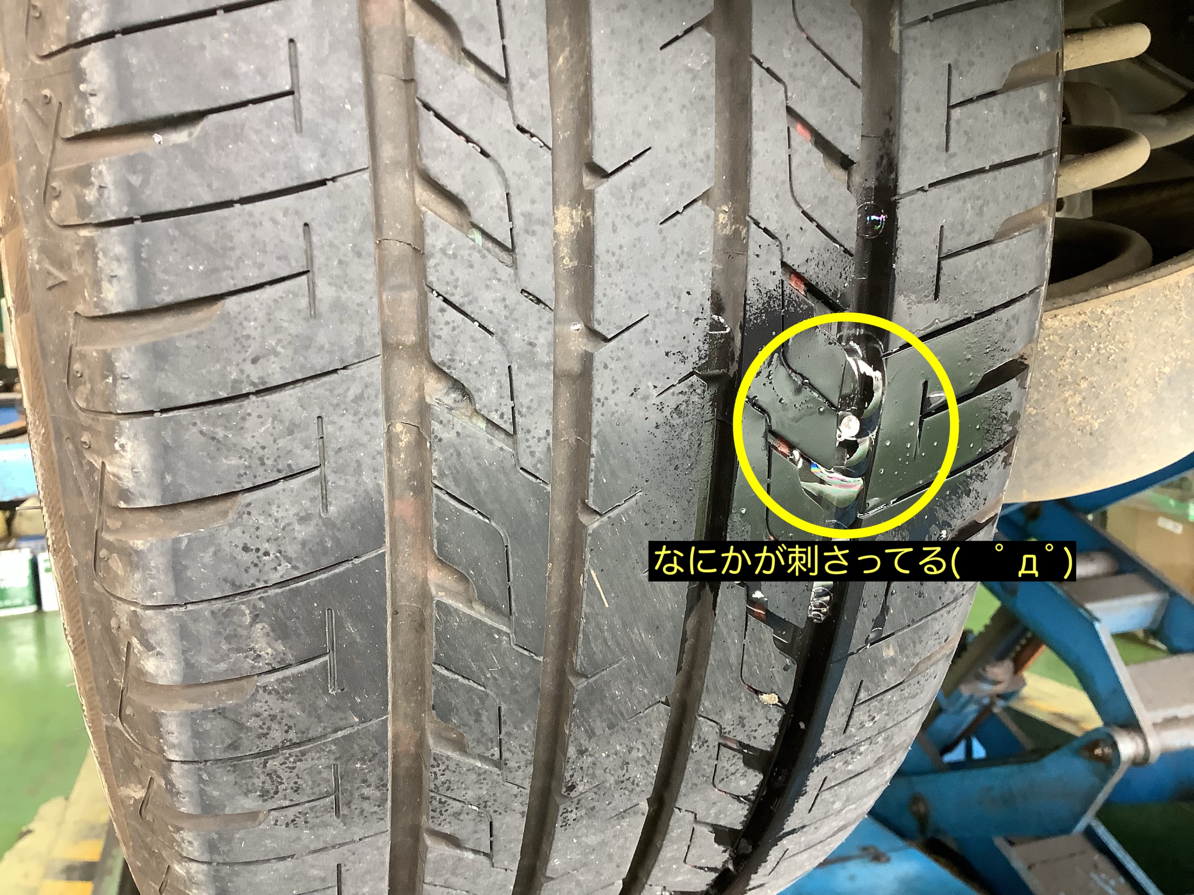 ↓まだ新しいタイヤでしたが、長いビスが。゚(*´□`)゚。