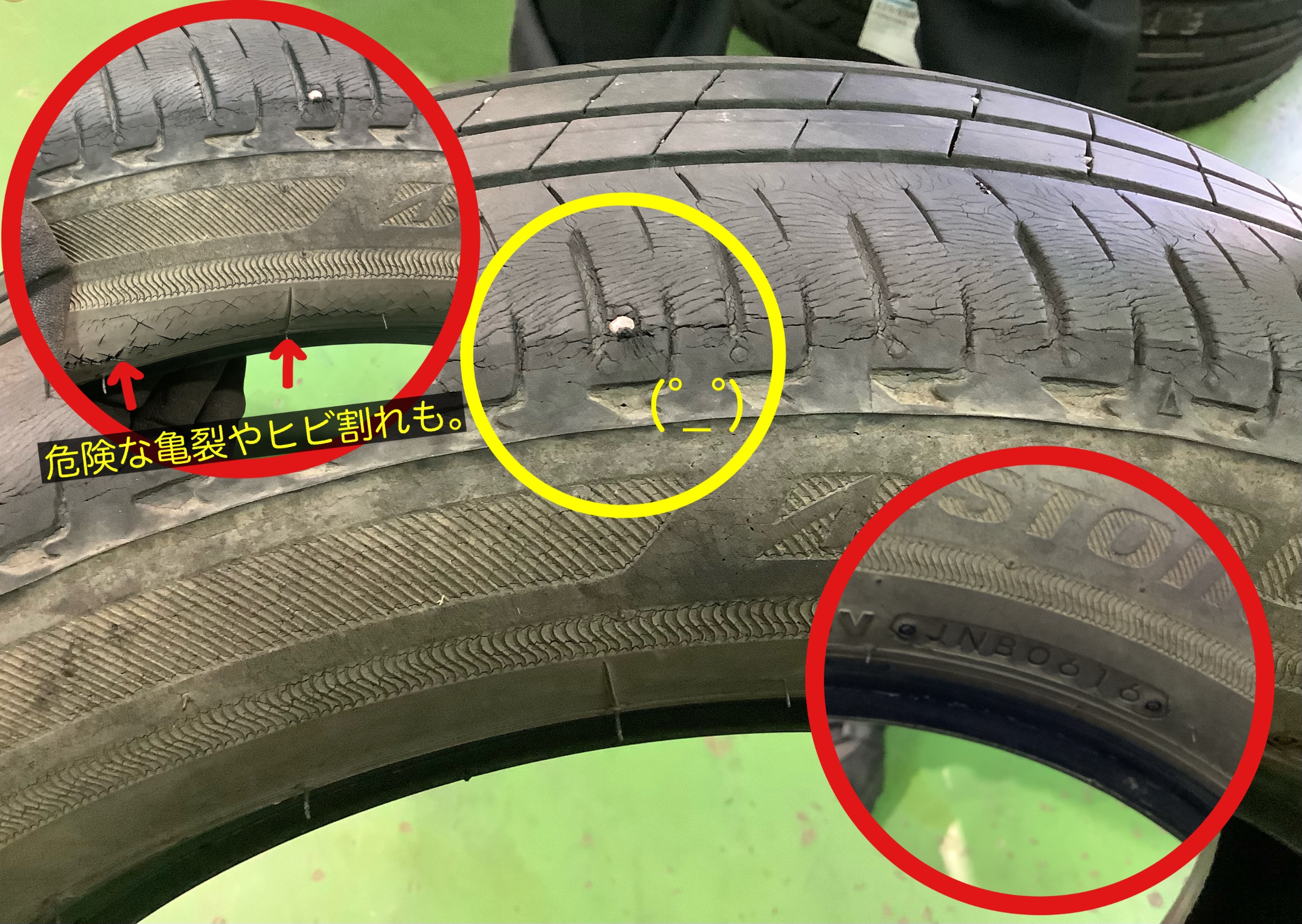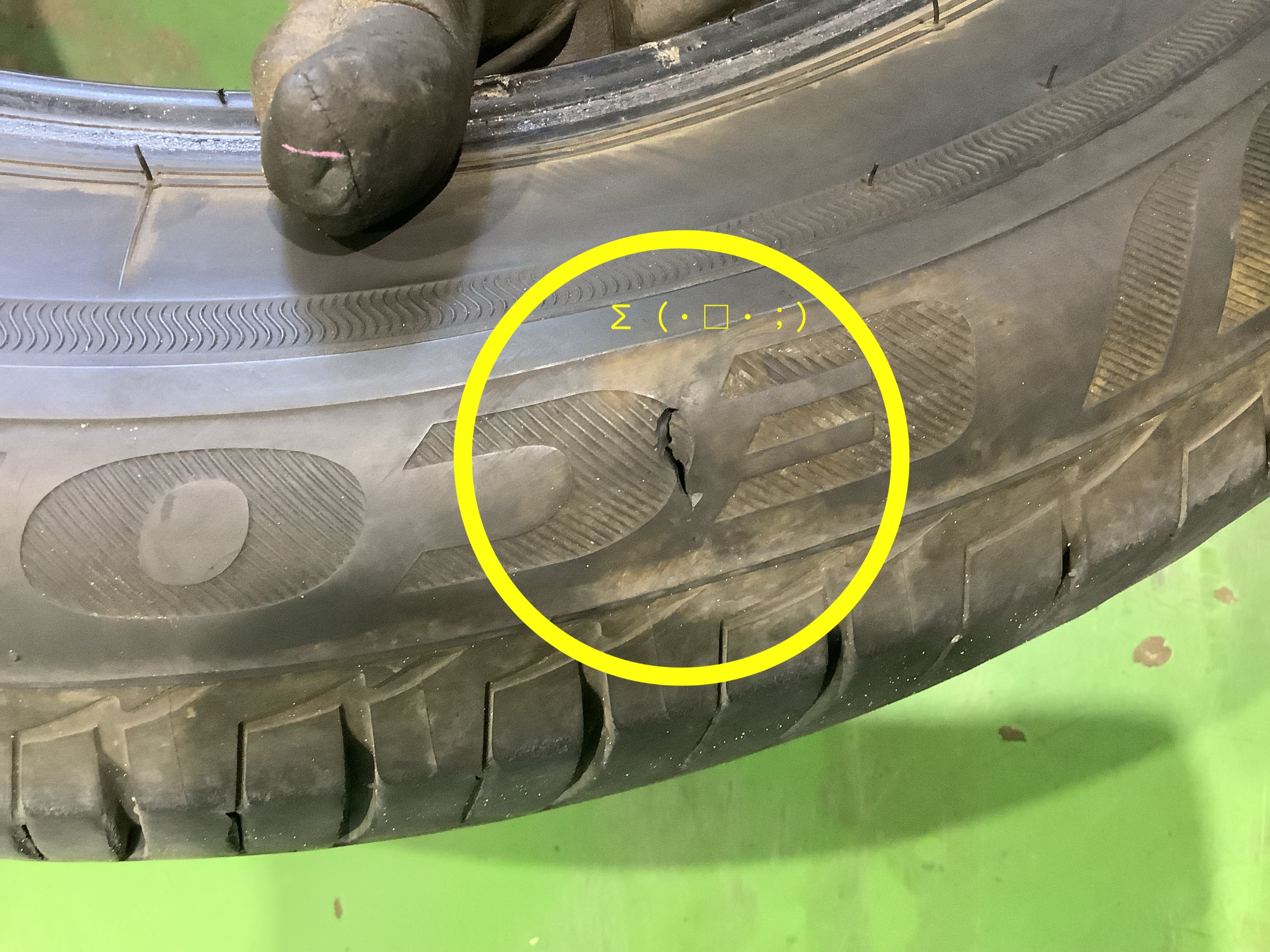 経年劣化と低内圧走行により、亀裂とヒビ割れも!Σ(´□`ノ)ノ
